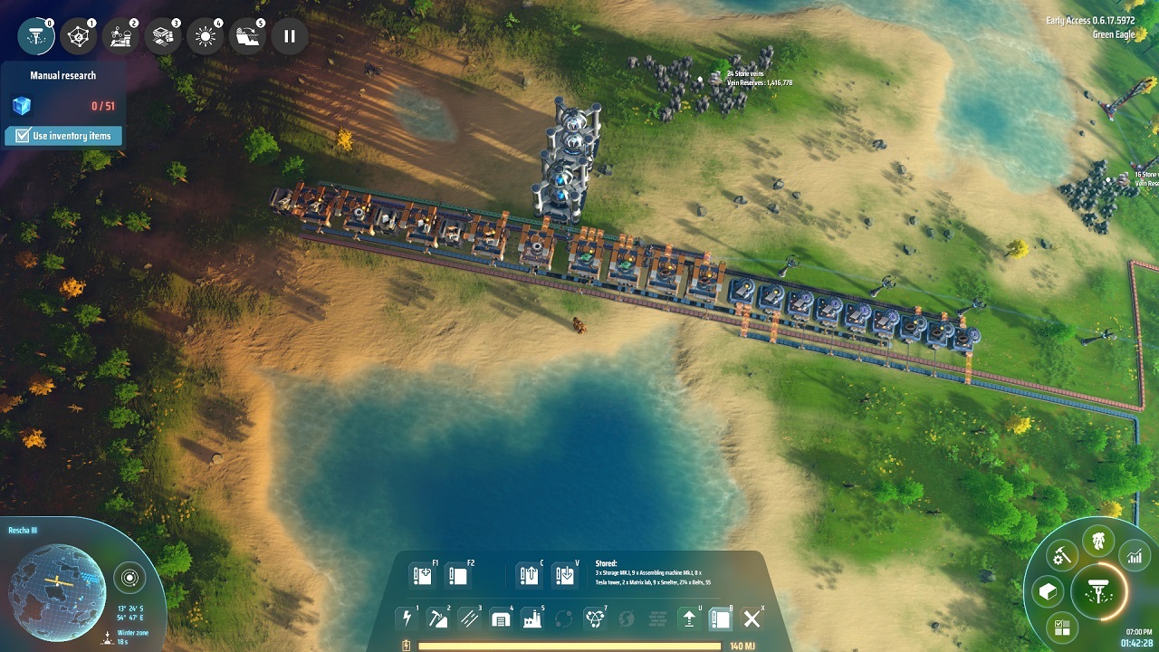 Needed to build before hand: (Hand crafting takes about 15m for the items needed) I just tested the blue print on a new save and it took 1:43 to get all blue science researched along with all manual research. Not included in the build are Steel and Energetic Graphite, you will need to set these up once unlocked.