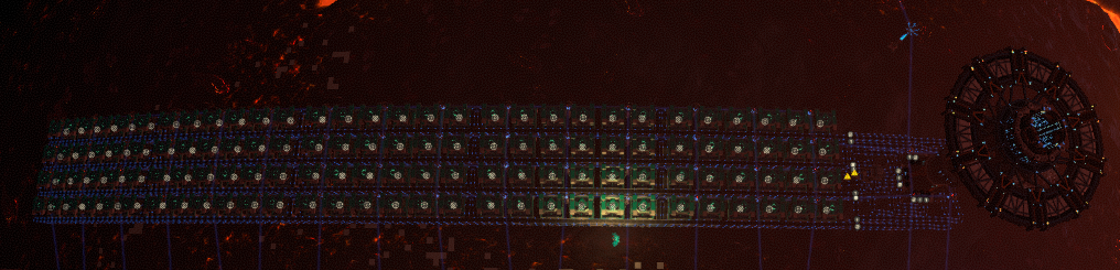 1 interplanetary with 4 assembly lines with 30 assemblers each. Each line has 2 imputs and 1 output (ideal for processor, circuits and transistors production). Belt bending allows to have 3 lines in 1 to make the scheem compact. The imputs are shown with numbers of each one and one of the imputs can be modified to be 4 half loaded belts or 4 full loaded belts.