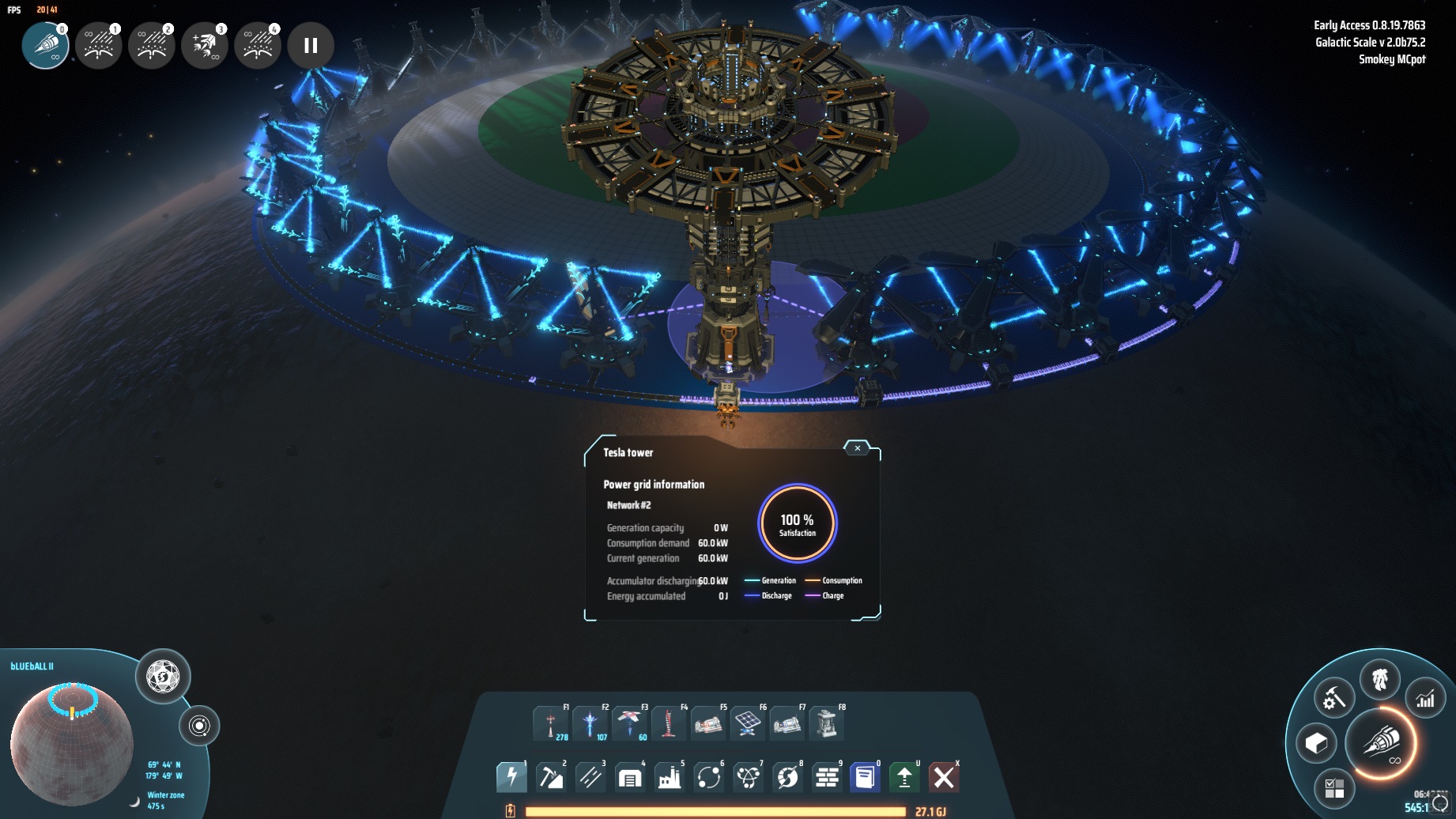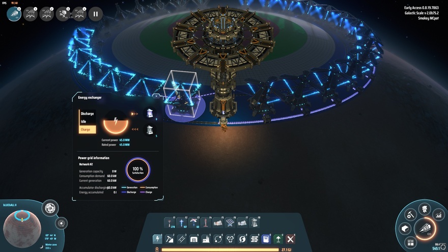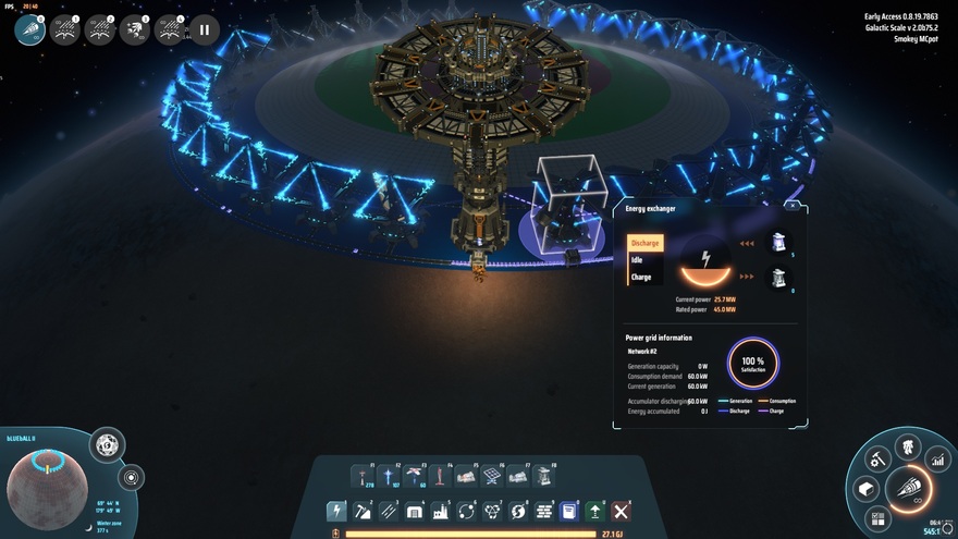 So You have a couple thousand of full Accumulators lying around in your Charge Bank. Time to put them to good use. Plonk down this third blueprint on any planet that needs (extra) power, extend the lines with as many energy Exchangers as you want, and get that sweet free power delivered by your Logistics Vessels. Make sure to extend both sides, since any accumulators being discharged needlessly will be ran through the chargers with priority, and their output will be prioritized to be used by the dischargers again, resulting in no power loss. Any excess local power generation will be sucked up by this bank aswell, completing the circle of 0 net overall power loss. Zero, yes, hence the name of this collection "Done Right". Don't believe me? Try it out and be amazed. No need to put Logistics Vessels in this ILS, let the Charge Bank take care of the deliveries. The picture shows a 630MW Discharge (and charge) Bank, which is available as a seperate blueprint in this collection and is compatible with my previously posted Polar Hub found here: https://www.dysonsphereblueprints.com/blueprints/polar-hub-720mw-artificial-sun . The white tiles can be populated with solar / wind / ray receivers for that extra bit of now recyclable local power.