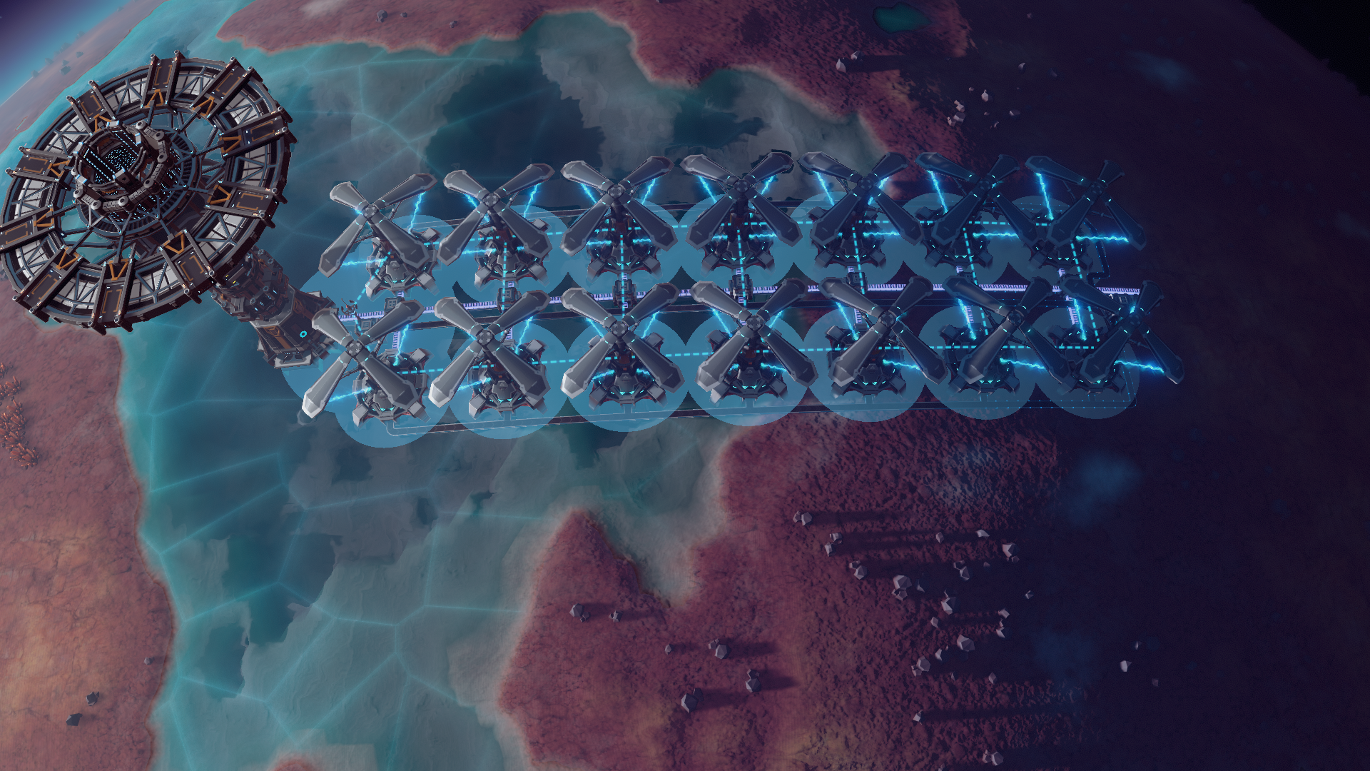 A power discharge cluster to help power the local grid. Additions can be added by deleting the tower from the blueprint before placement. Additions can be placed at the far end (a belt to belt match) or can can be placed side by side, with a minimal belt run to the existing tower. The configuration can be easily flipped to a charge cluster, changing the tower filter and the supply/demand switches. No re-work of belts needed.