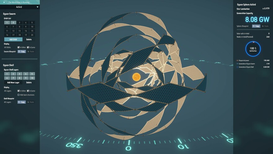 If you feel the need to change the design to make it fit in your choice of a star system, you can copy a single layer and paste it on a new layer, it will still keep the overall design but the size and orbit will depend on your new layer. You can even alter the orbit's direction and inclination in the Dyson Sphere management page by selecting the Dyson layer and clicking the cogs icon located below the orbit radius.