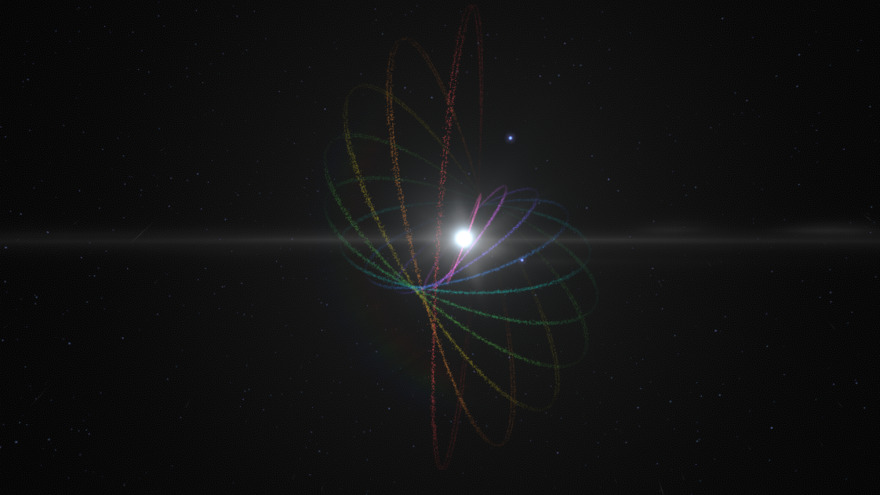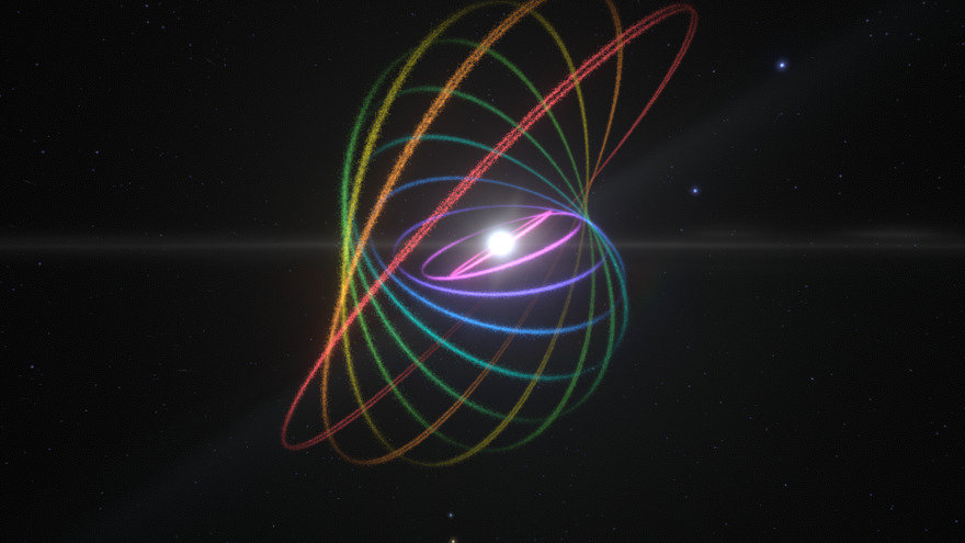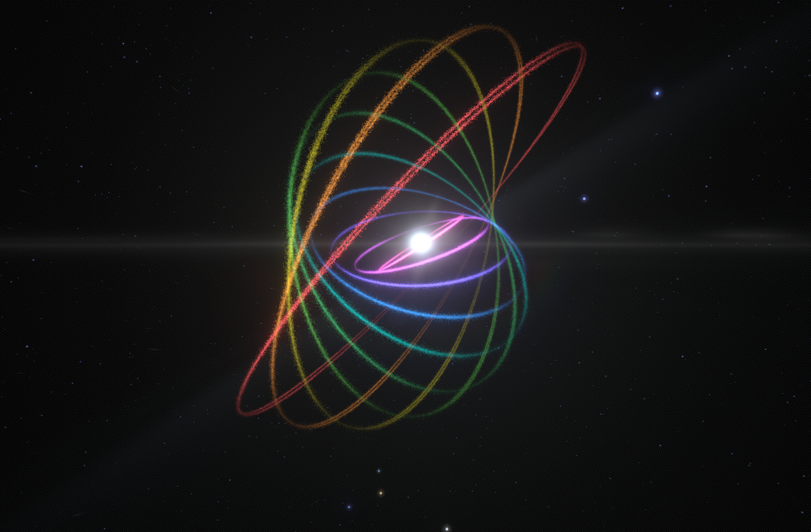 Rainbow rings in a twisting spiral.