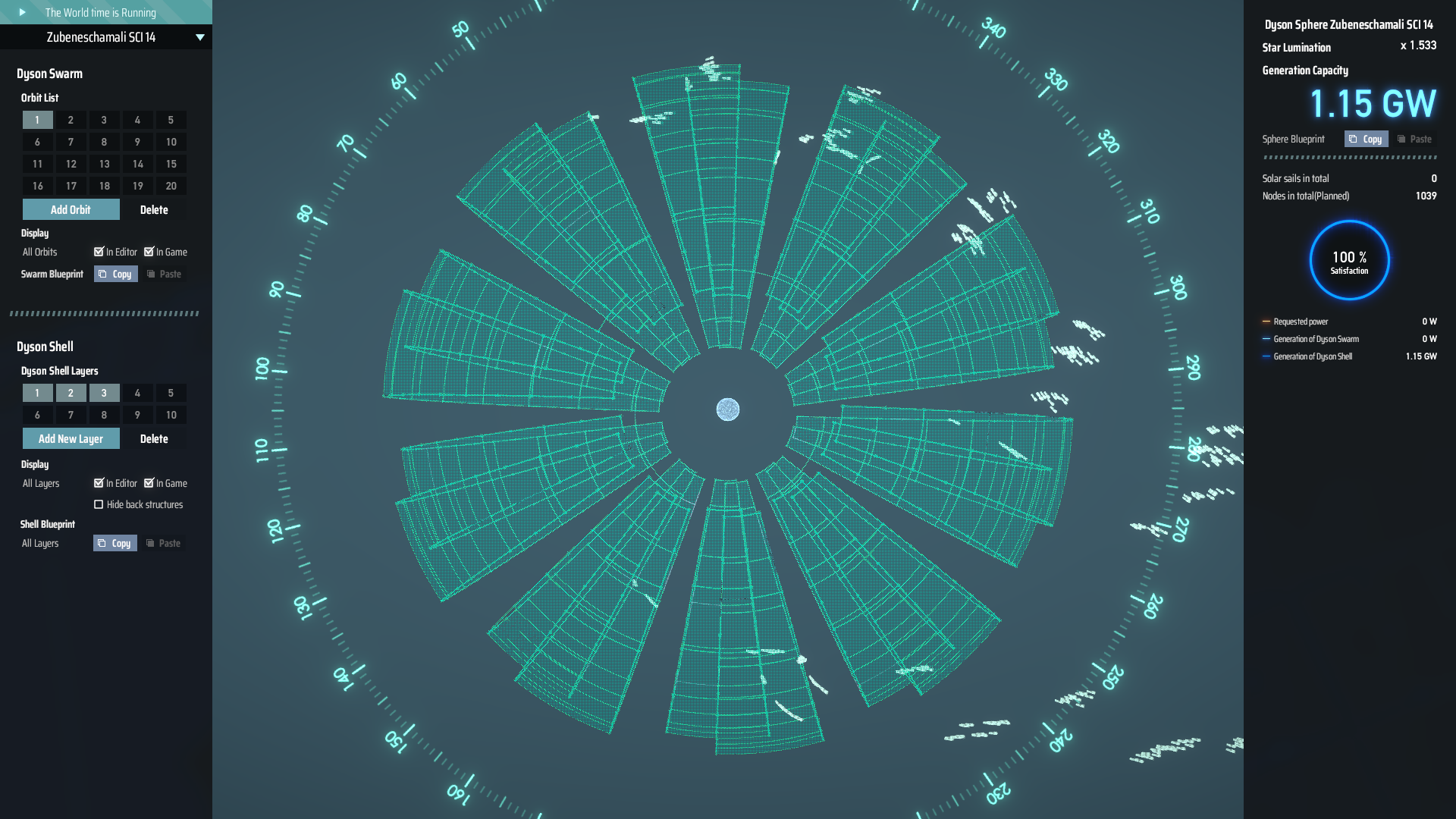 2 spheres of long, evenly spaced panels, each orbiting in opposite directions. Full sphere generation with a light show. Photo is top-down and partly constructed to show details better.