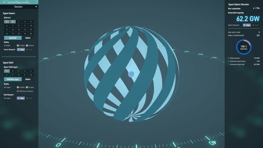 Basically a swirly sphere but with 10 lines on it. Probably my biggest Sphere yet, with a radius of 27k, costing around 84k structure points and 1.9 million cell points. I built it around a class B star cause I needed the immense power to make all the Critical Photons I needed for my research, my only mistake was building with minimum amount of nodes needed, it made building the shells very slow since the nodes have a very slow sail absorption rate. Feel free to use this and add some changes to it, it often works best around Class B or A stars, but try going for a smaller radius.