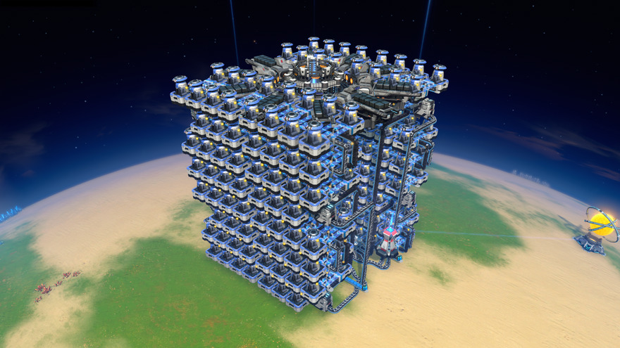 此藍圖藉由藍圖編輯器製作,以立體堆疊熔爐使單元更加緊湊。除了電力塔,全部在星際物流的碰撞範圍內。