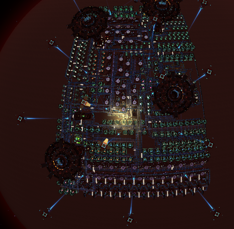 Up to 20 on a single planet! DF buildings. Raw resouces -> Rockets. Proliferator Mk.3 and Space Warpers are produced inside bp. All proliferated for products (except for fractionators). Imports 4952 Hydrogen 4717 Silicon Ore 4322 Titanium Ore 4047 Coal 4009 Iron Ore 3157 Fire Ice 1860 Copper Ore 1518 Stone 1045 Sulfuric Acid 507 Water 203 Organic Crystal ~ Deuterium Deuterium isn't essential. It is produced internally by fractionators. Energy usage is between 2.6GW and 3.2GW.