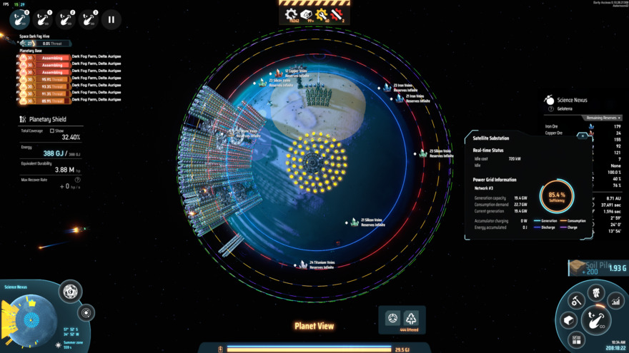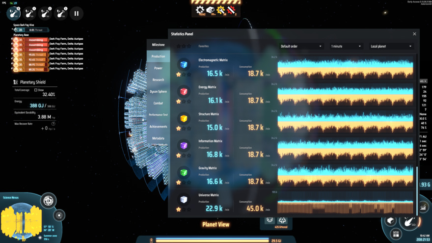 28.8K/min universe matrix segment for research planet, including some planetary shields too. It is highly advised that you import self-evo labs and conveyor belts with a seperate ILS. Produces all the colored cubes, and some space warpers as well. Does not include antimatter production for universe matrix. Fully proliferated, produces 50% more cubes from the same input. So you only need to prepare materials to produce 18432 cubes per minute from other planets, and it will produce 28800 white cubes per minute. The power draw of self-evolution labs are insane, this would theoretically be able to draw up to 38 GW, but it is not operating at full capacity in the screenshots. If you put 5 of these to cover the entire planet, it could draw well over 100GW.