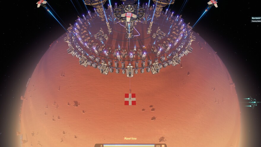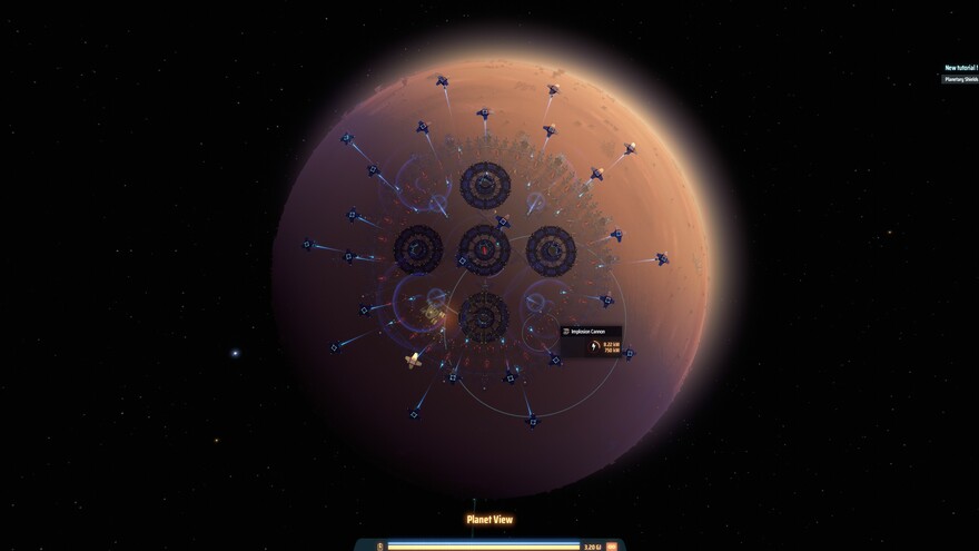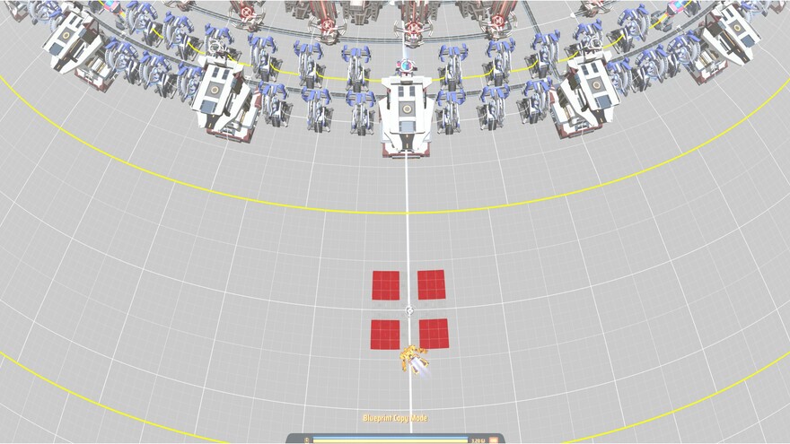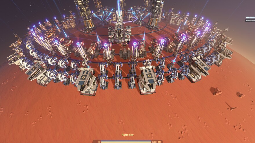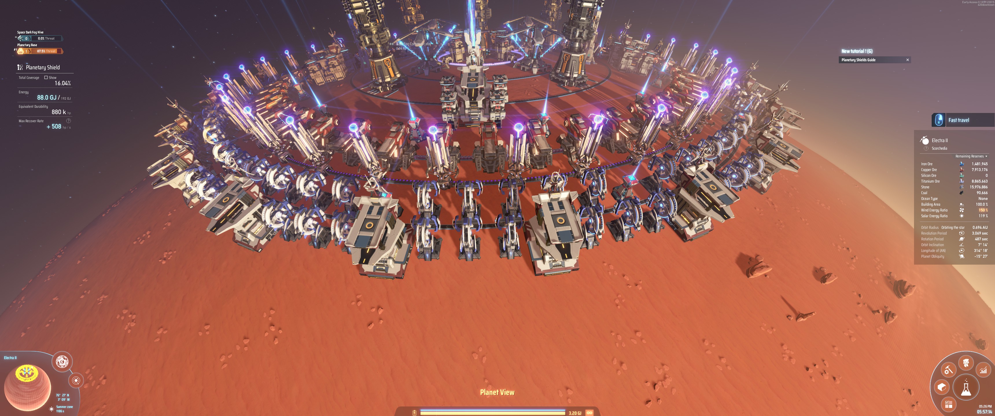 Energy exchangers power this beast of a Dark Fog farm. A ring of laser turrets, SR plasma turrets and implosion cannons ensure rapid obliteration of enemy units. This farm will automatically repair and replace any front line building subjected to hostilities. A fully automatic sort and export system is included for up to 15 items in the loot table. Set the Dark Fog filters in the BABs to suit your needs and connect filtered sorters to match on the 3 empty ILS towers. The blueprint was copied for use on the North pole. To provide ease of blueprint placement, a single Tesla tower is included in the print. Proceed to co-ordinates 60N, 0W and face the North pole (invert the co-ordinates for use on the South pole). Align the blueprint so that the Tesla tower is on the intersection of the meridian lines as shown in the screenshots. It would be best to delete 3 of the planetary shield generators and re-install them one at a time as they charge up to prevent a power brown-out at initial power up.