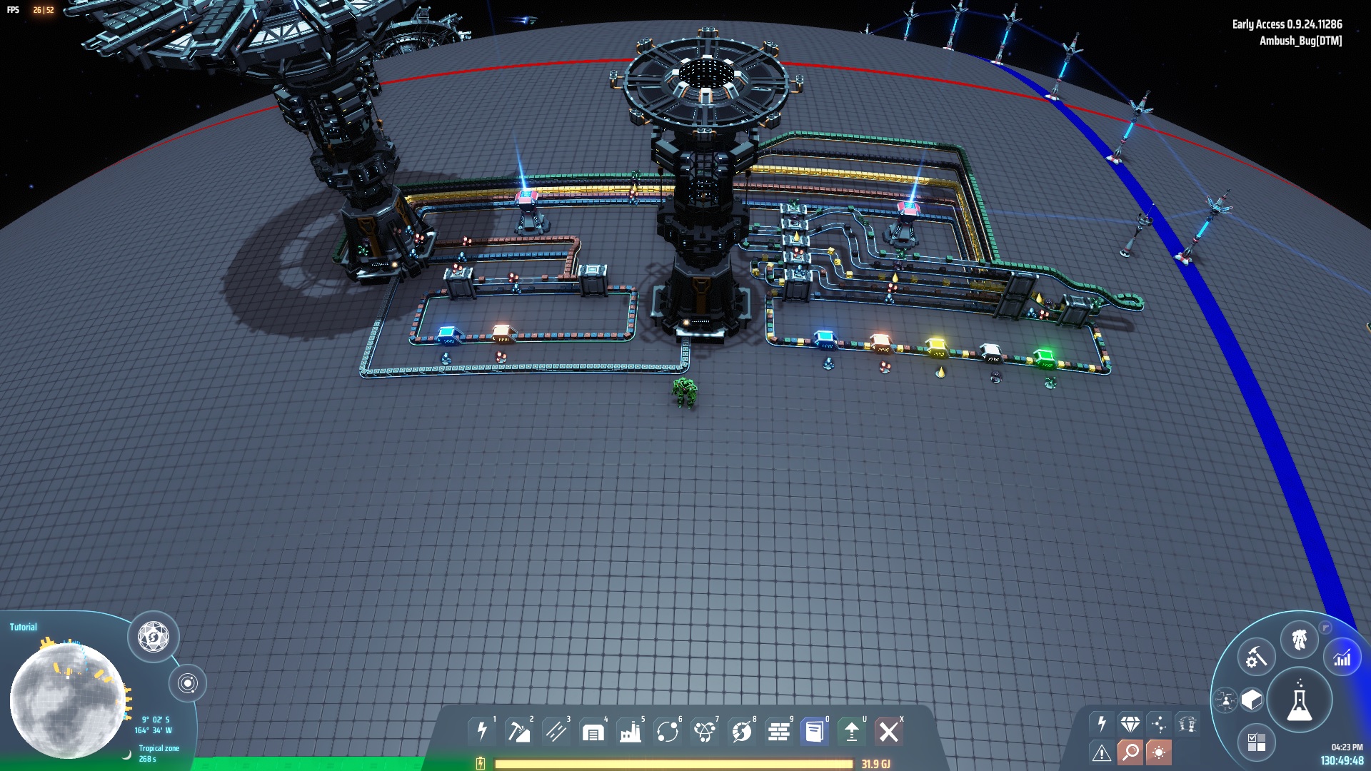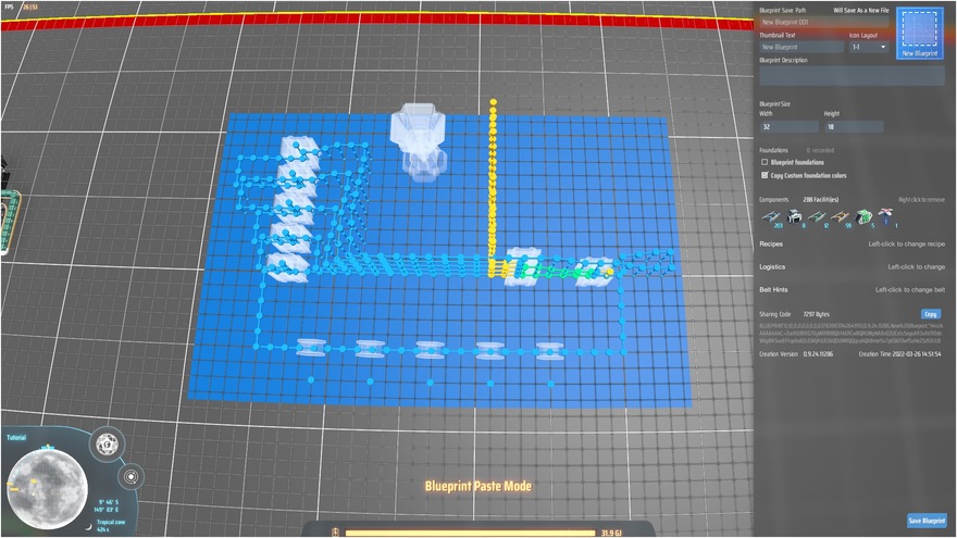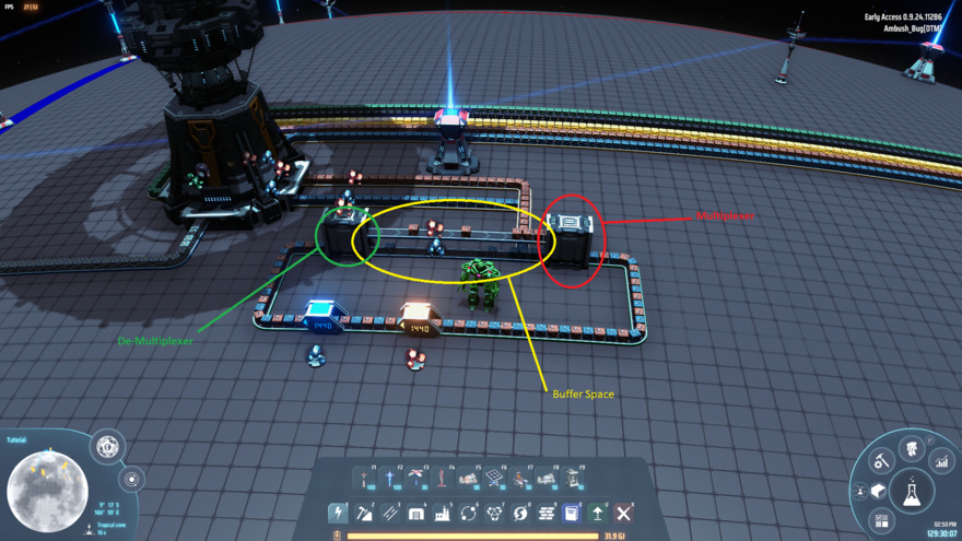 This is a demonstrator blueprint to show how the multiplexers in the Parasol Mall are built. This is a kind of "exploded diagram" that uses standard belting to make the logic and arrangement clear and easy to see.