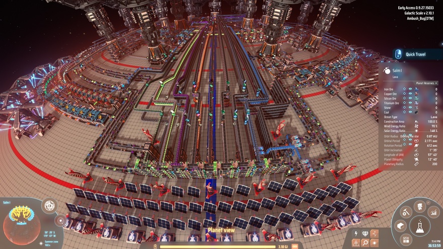 Antimatter Option: Le Gasp. The No-Hazmat-Permit guy using antimatter?! Well, no, not by default. I figured folks would like a built-in option to tie this into their late-game power networks or use it if they didn't have exchangers set up in their empire. To that end, I threw in a line of suns fed by logistics bots, tied into the "extra" ILS in the product output line. (The one near the launcher assembler.) All you have to do is flip the switch to remote demand, schlep some batteries over to the first few suns and prime. After that, there's a fairly large ring of accumulators in the mall to cover power gaps and surges.