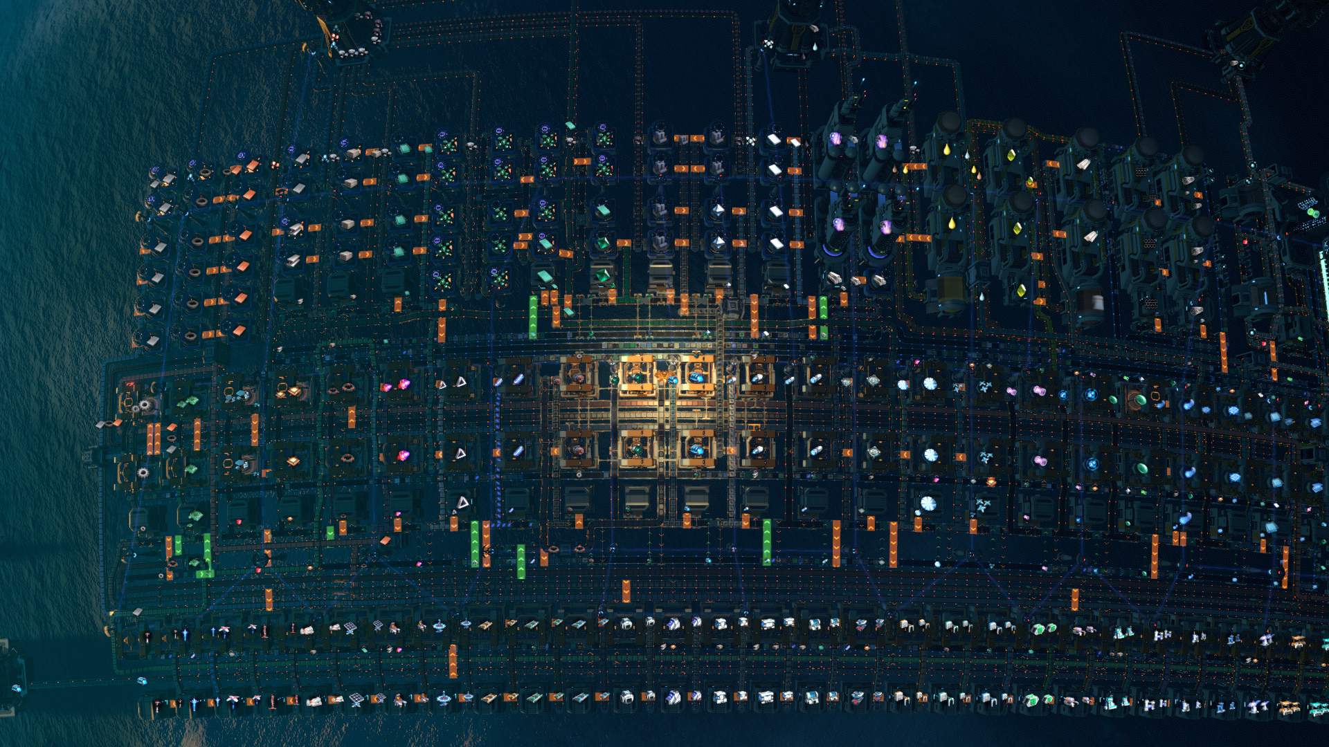 1-整体设计为上中下单环线【防堵料】结构,辅助8条需求大的物品输入传送带,正常铺设无仙术,结构紧凑占地面积小。