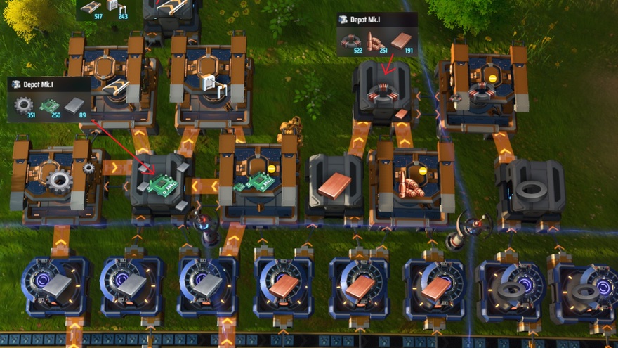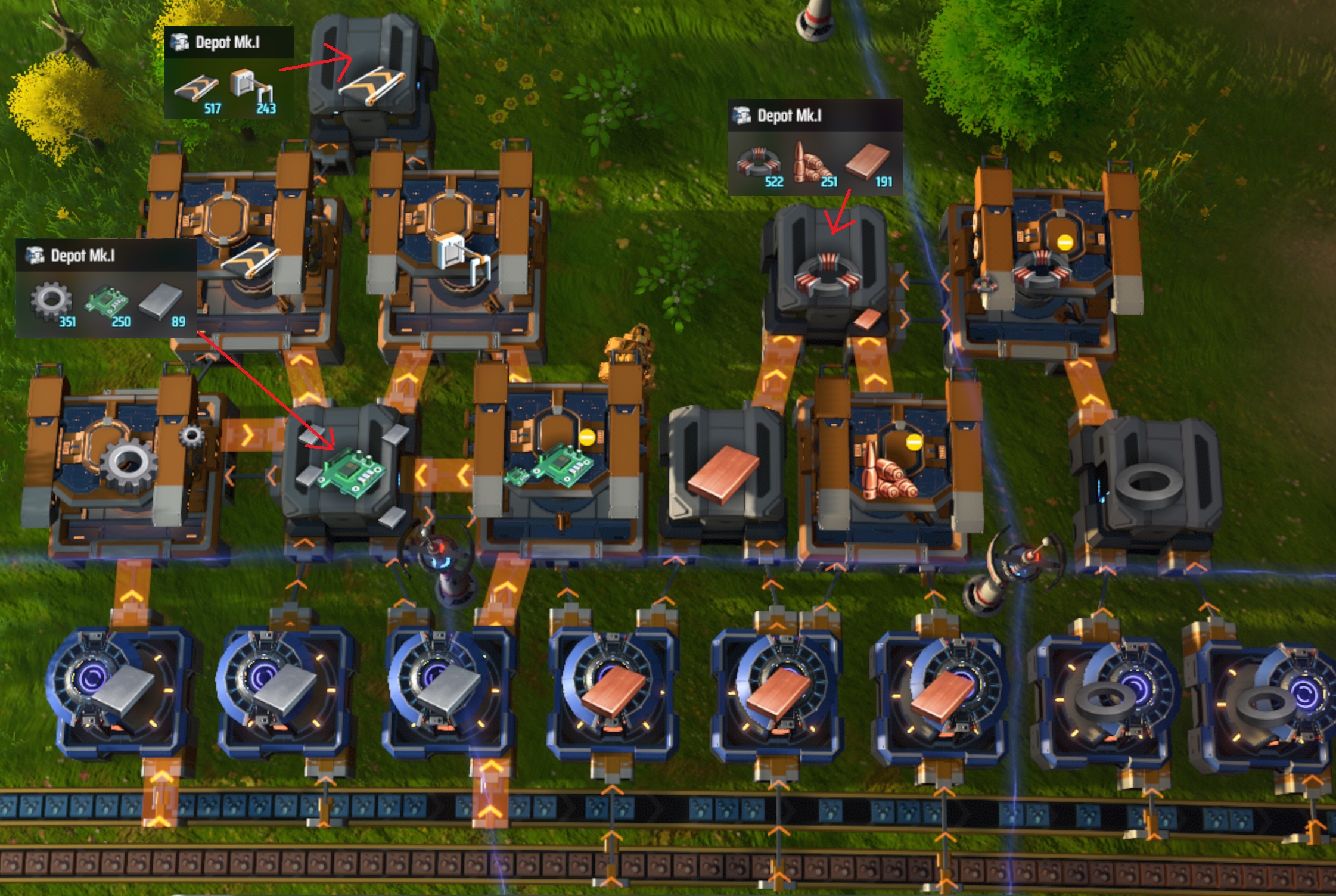First mall for quick start. Just self-make enough for the blueprint and 5MW power (plus a little for your first turrets). Produces iron plate, copper plate, magnet, magnetic coil, circuit board, gear, magnum ammo box, conveyor belt mk.1, sorter mk.1. All with 110 facilities.