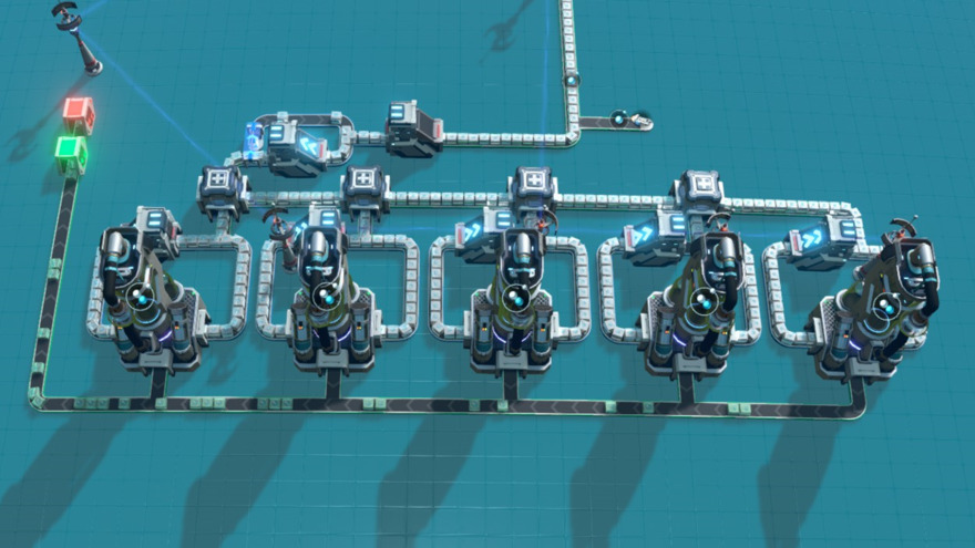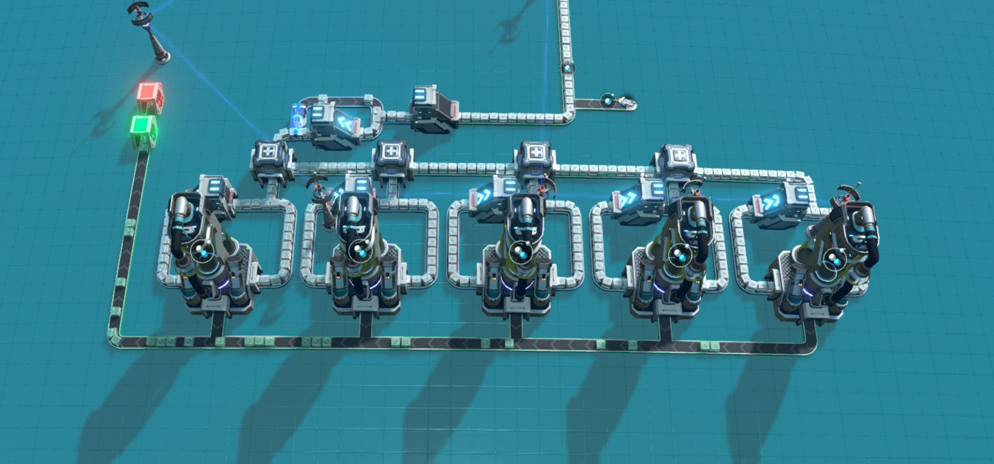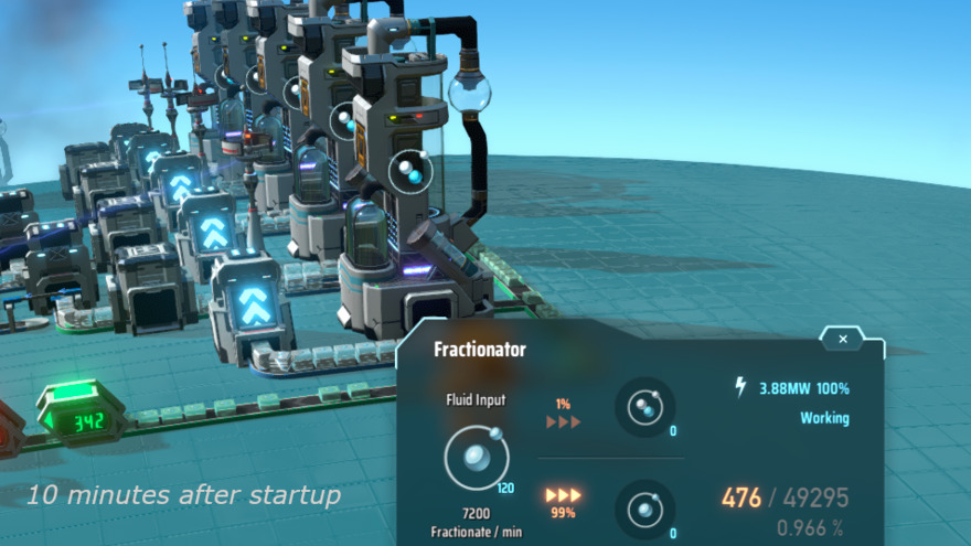 This build also uses splitters to prioritize completely filling each fractionator in series to maintain good power economy when the H2 supply is low or intermittent. It's robust and recovers automatically from intermittent H2 supply, blocked output and power outages.