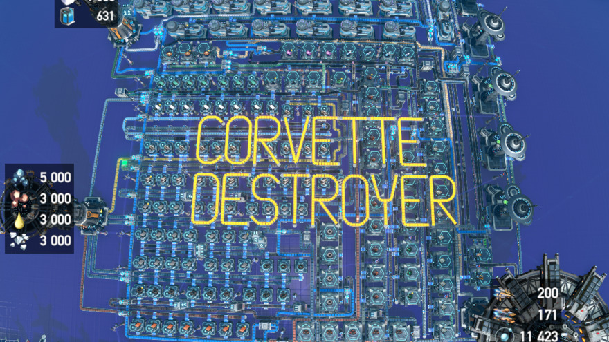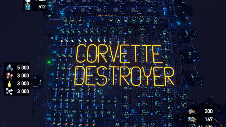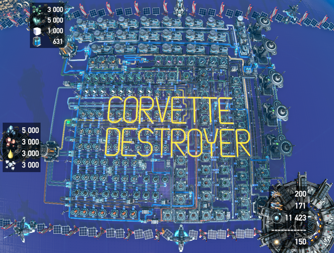 Note! If you dont yet have Negentropy Smelter (Mk.III) or Re-composing Assembler (Mk.IIII), you can downgrade to Plane Smelter and Assembling Machine Mk.III and produce Corvette @ 19 min & Destroyer @ 14 min.