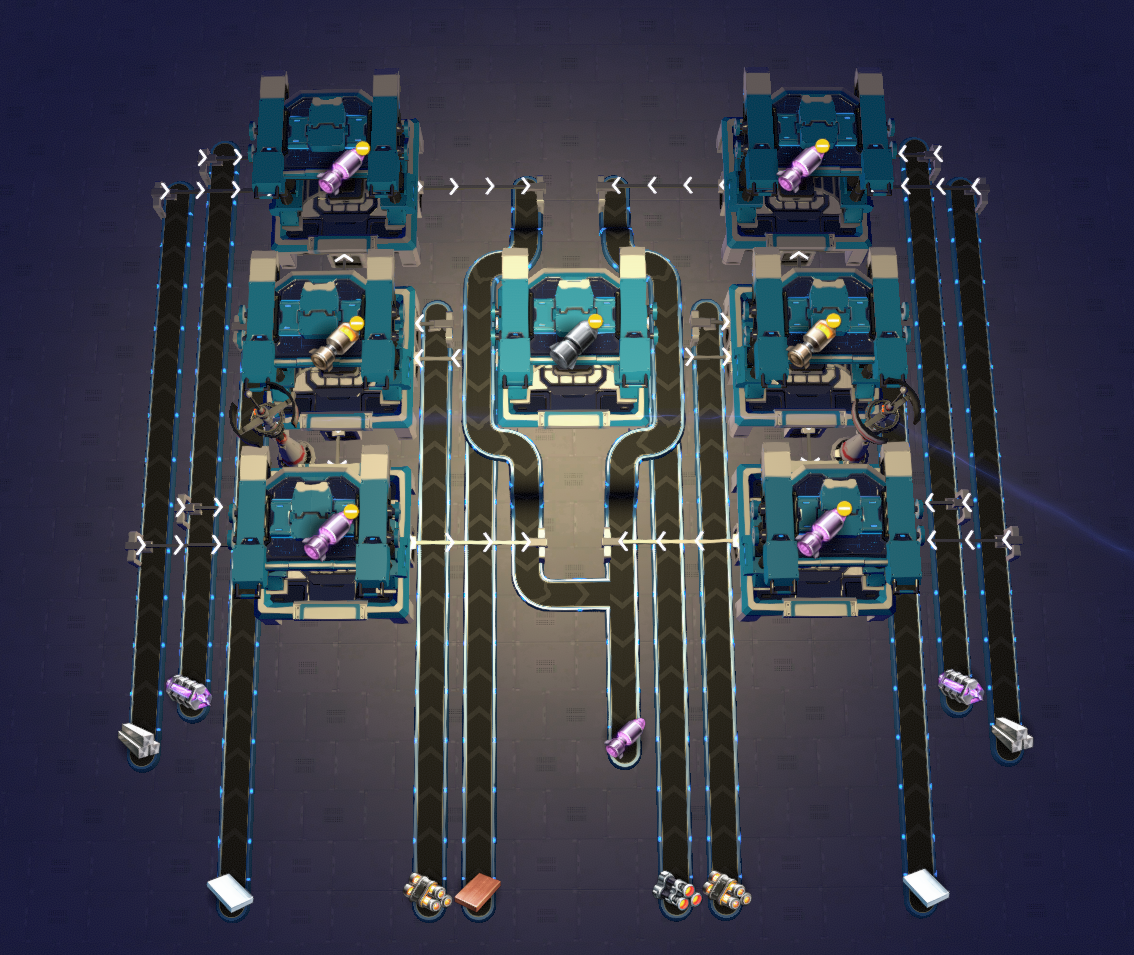 Fully modular crystal shells from basic materials. Produces 30 crystal shell sets per minute with the Mk 1 assemblers, no proliferation possible since it sends the products directly into the next machine.  Consumes 270 copper, 60 combustible units, 90 titanium, 30 explosive units, 45 titanium alloy, and 30 crystal explosives per minute per grouping.  Double for Mk 3 assemblers.  Copper is the limiting ingredient, so this can handle up to 13 segments on a Mk 3 belt with fully stacked copper without needing an infusion of copper.