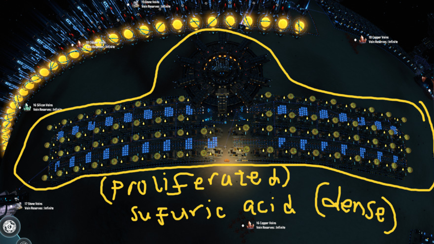 DENSE Sulfuric Acid 12.5(chemical plant rate) x 68(chemical plants = 850/min Sulfuric acid (Proliferated) Raw: water, stone, refined oil. 68 Chemical factory. Space Warper input at the back of interstellar logistic station. Tech limit 4 optimized.