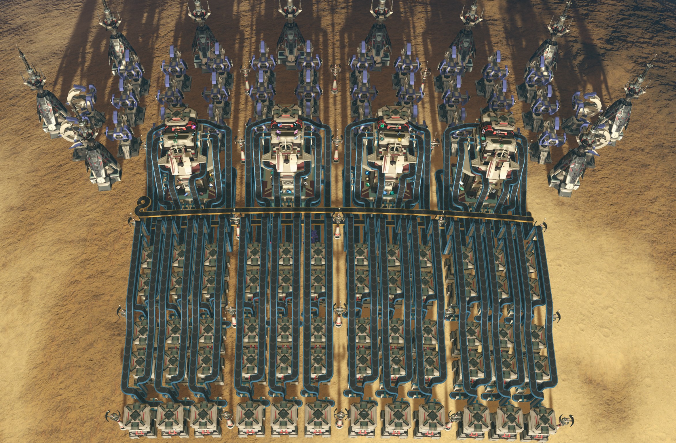 Place around 40 lines away from outer buildings of Darkfog to keep constant aggro. Yellow belt is for proliferation (spray coaters need to be placed manually because the bp is bugging with them)