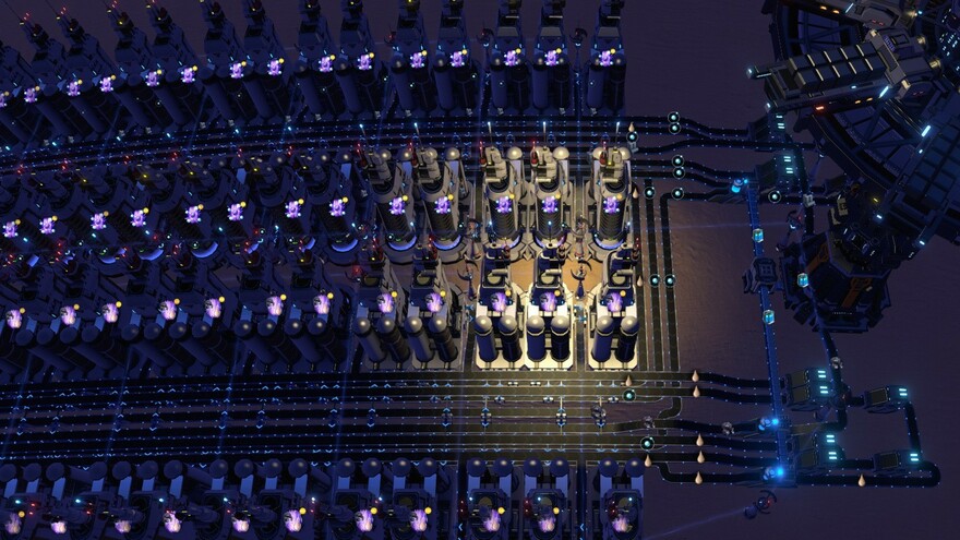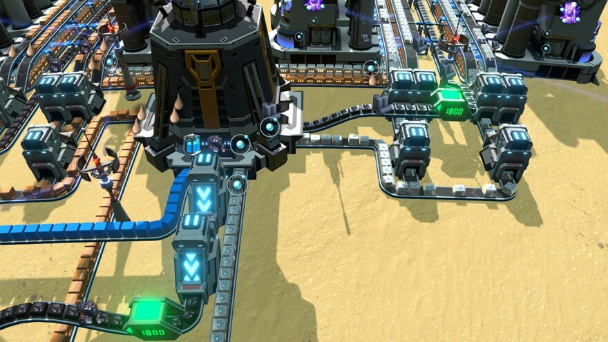 Finally, it's OPTIONAL to use the tower as a "buffer", but I like that it provides a constant "flow" of 4-stacked Hydrogen and Refined Oil; it's easy to re-route belts around the tower if you prefer to do so. Credit to /u/idlemachinations on reddit for the idea to use "loops" here.