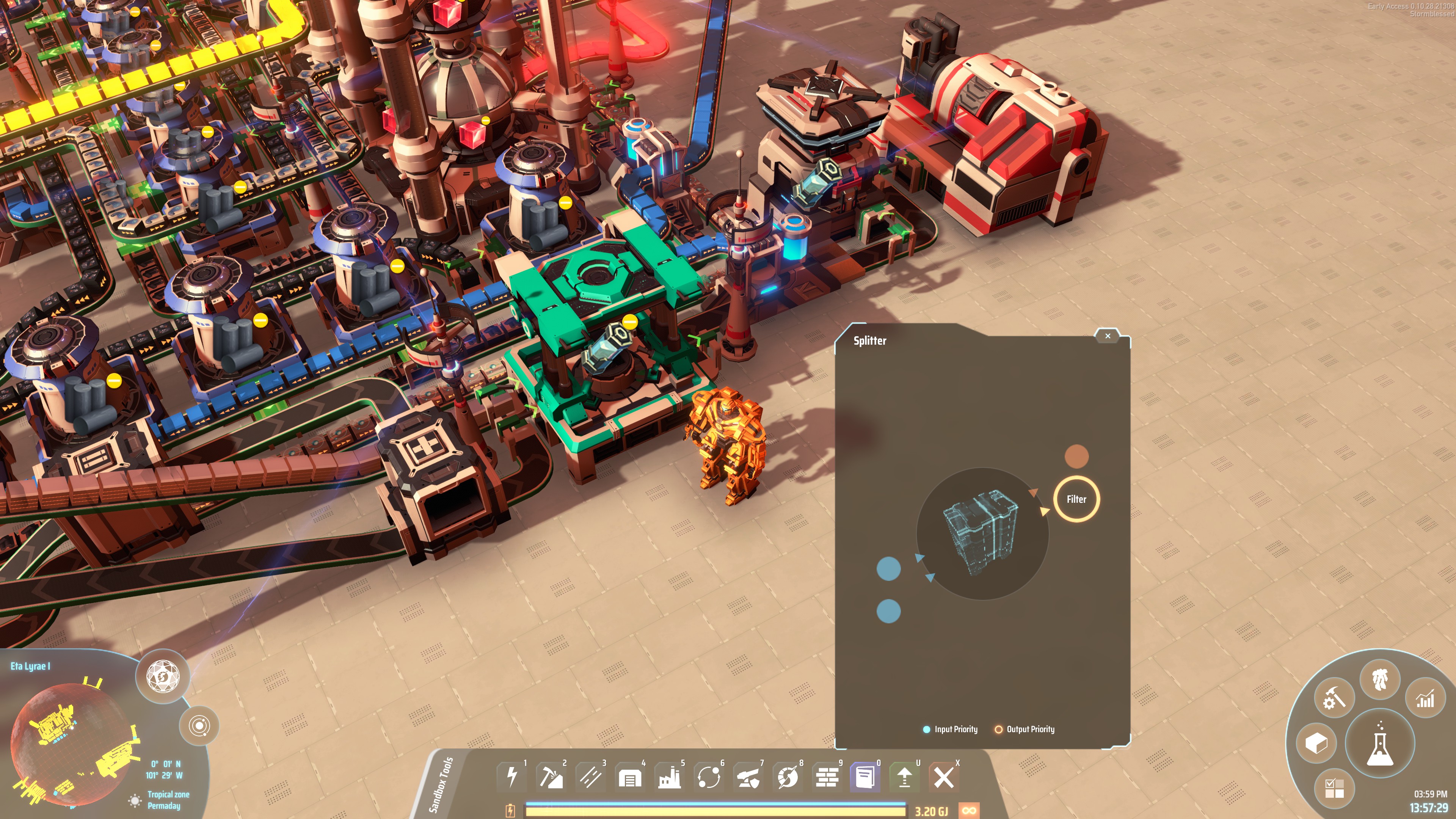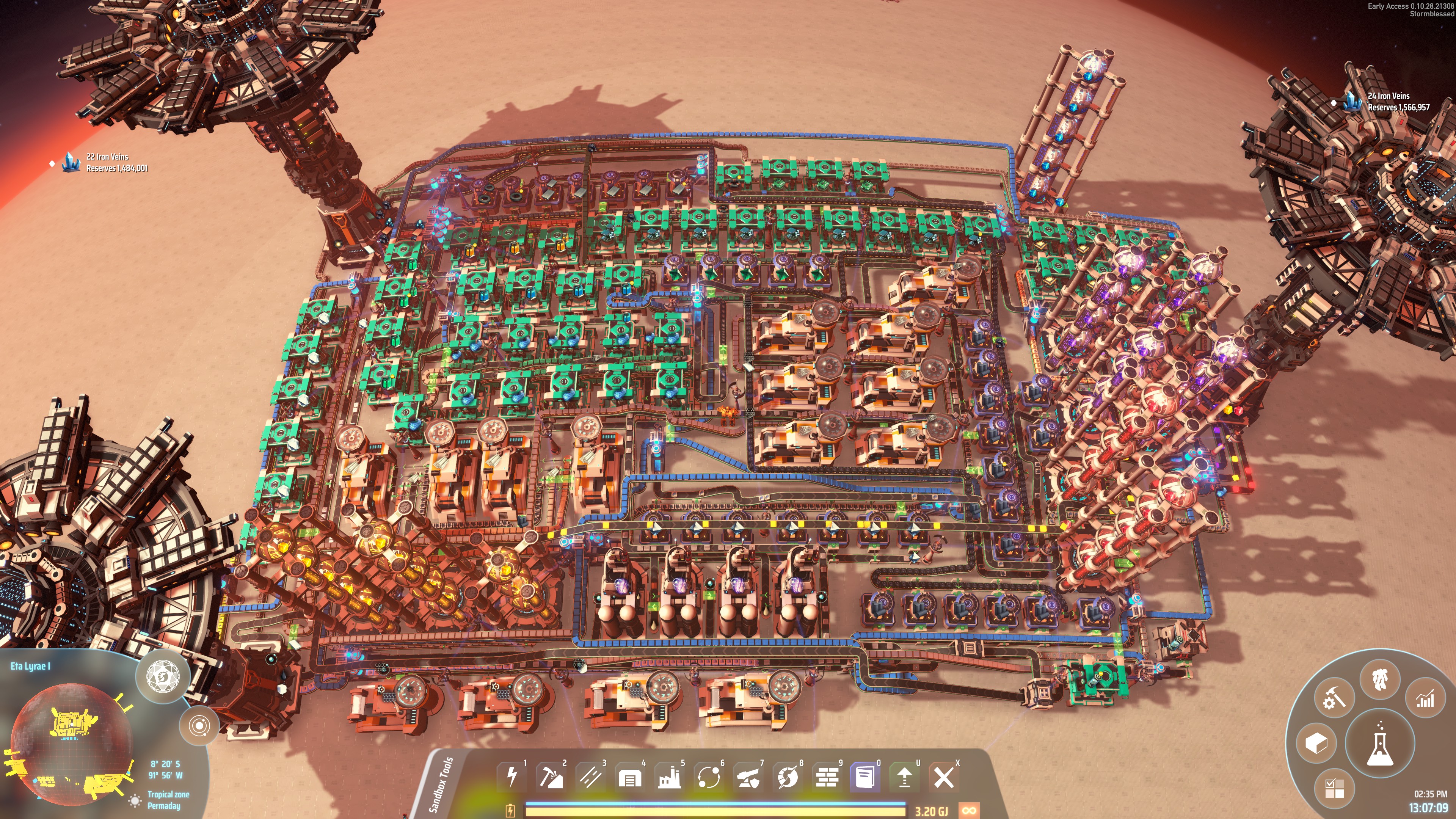 This build (especially the purple science) takes a long time to fully start up. It can take upwards of thirty minutes to see all four sciences reach 120/min, but you should at least see production reach a minimum of 60/min within a few minutes of completing the build. If you want to speed this up, manually load some Proliferator Mk. III into the system before starting the factory (you’ll know you’ve added enough when the proliferator overflow is routed to the ILS for export)