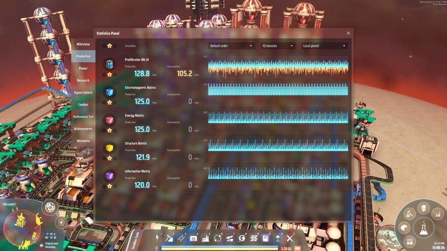 Produces all science cubes up to purple at 120 per minute (2/sec), proliferates them, and exports them in an ILS. Proliferates every production step using internally-produced proliferator, and exports the excess proliferator in an ILS (approximately 25/min). Excess hydrogen is consumed to produce (proliferated) fuel rods exported to either Icarus or another distributor via logistics bots, then burns excess rods in a thermal power plant, then exports any remaining hydrogen in the ILS. Requests and distributes warpers once the technology is unlocked.