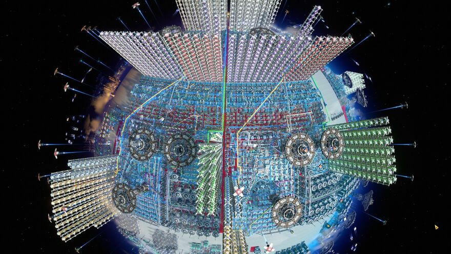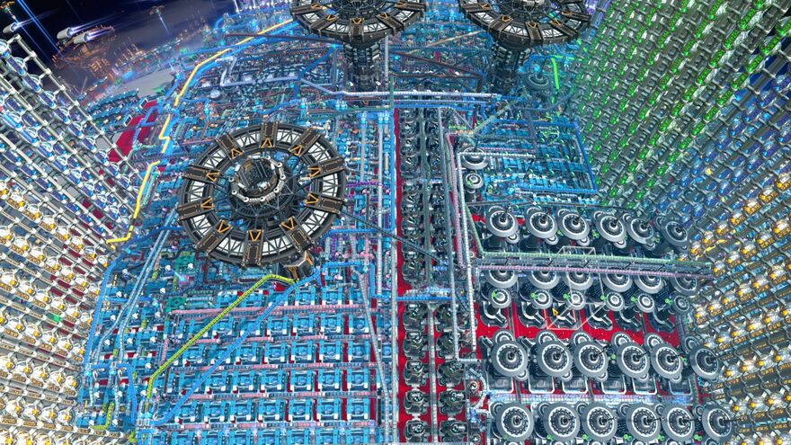 Exports white science to offsite research labs, and imports antimatter from offsite, as well as every relevant rare. Artificial stars at the top can be replaced with research labs if you have really high research speed, otherwise the AM rods can be fed into a polar star cap. Uses the following production chain.