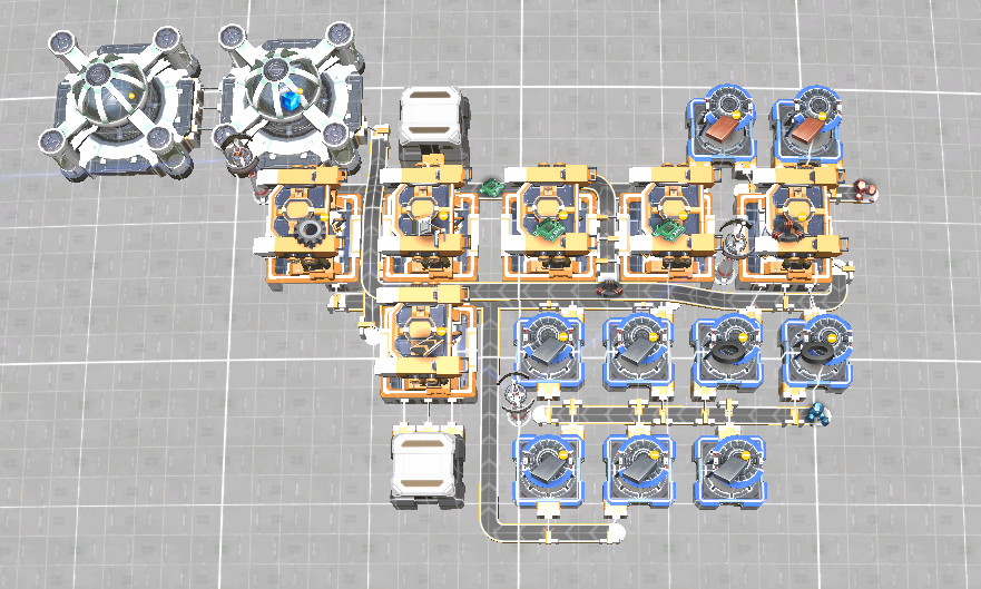 Designed to be the first blueprint to put down. Starts belt/sorter production while capping out a three high tower of blue science. It also intentionally has an iron smelter not hooked up to anything for you to pull from. The idea behind this is that it's researching the next blueprint unlock while you're starting the components for your mall.