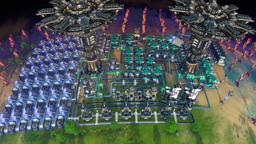 upgrade your power grid when you reach yellow science. the factory feeds 42 fusion power plants with double proliferated rods for 720 MW at full load. the factory produces a small amount extra because i rounded everything up in the plan. it is enough to keep your mecha fueled, but not enough to export. if you want that just use this same blueprint, but right click off the fusion plants. thee factory is self proliferated and fits inside a 1/40 pizza.