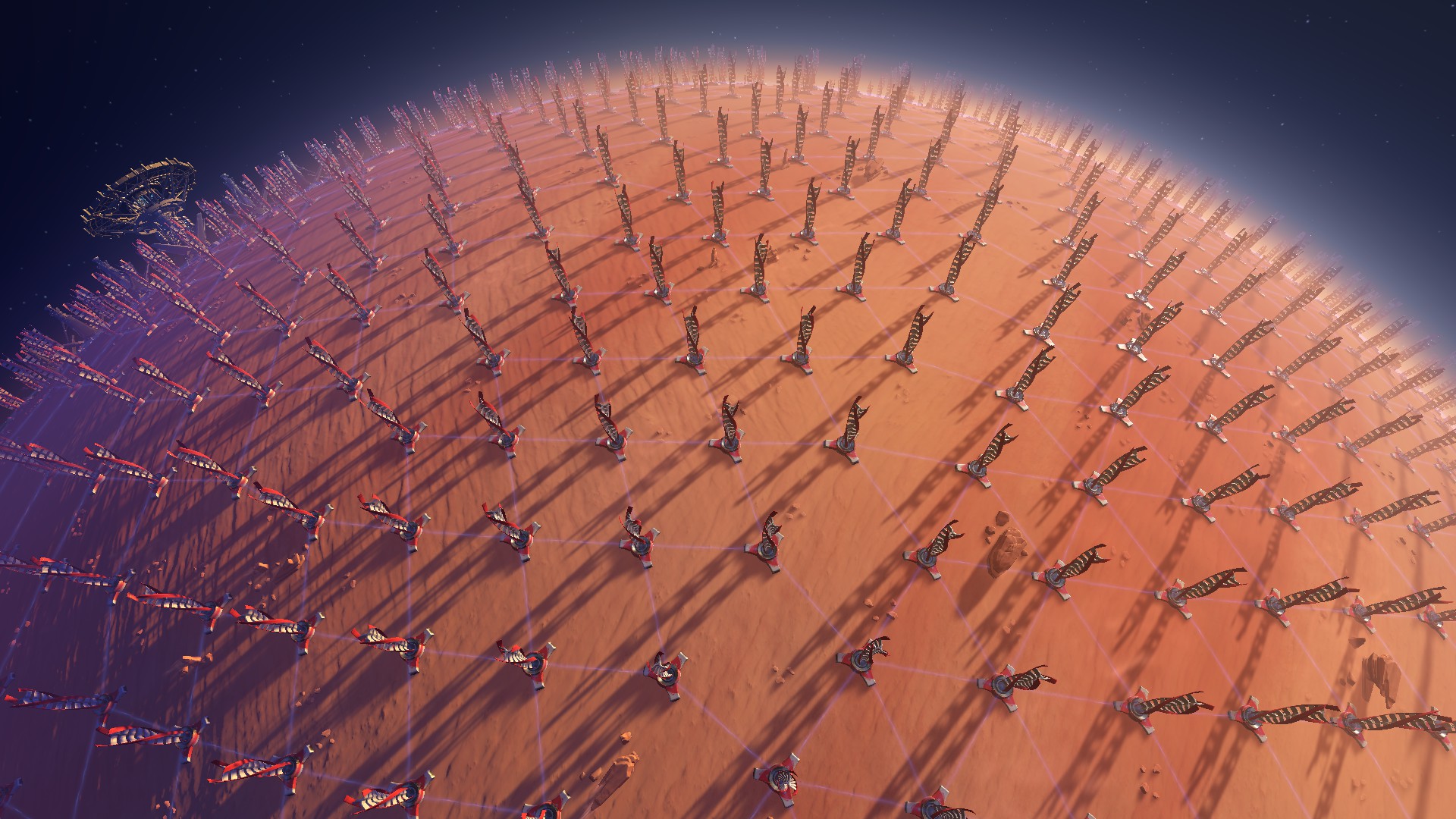 I present the logical conclusion of your factory's wind farm. With this blueprint, you can cover any planet you like with 4,424 wind turbines, allowing you to generate up to 2.12GW* of completely renewable energy for whatever purposes you require, even if you've barely unlocked yellow research. The poles include 1 ILS and 24 energy exchangers each, allowing you to export the generated power wherever you like. Accumulators sold separately.
