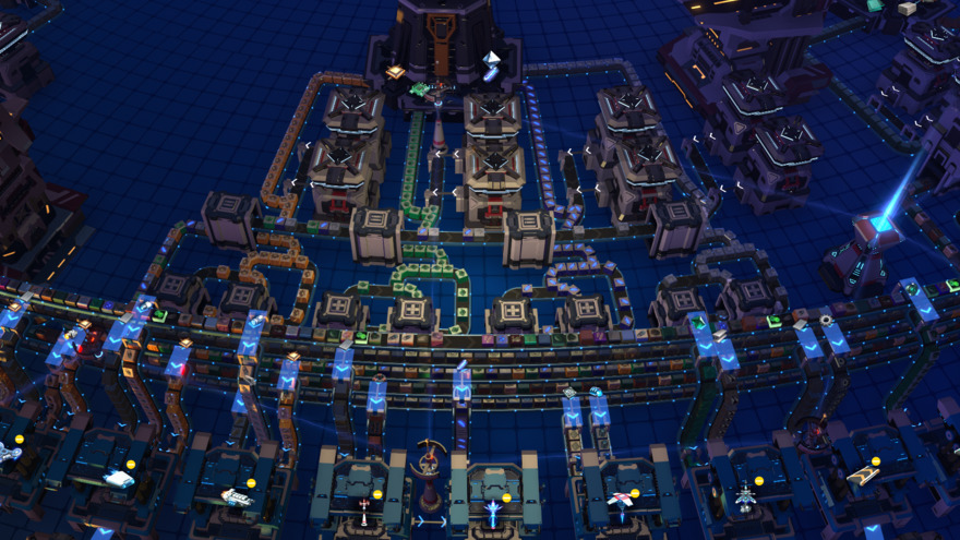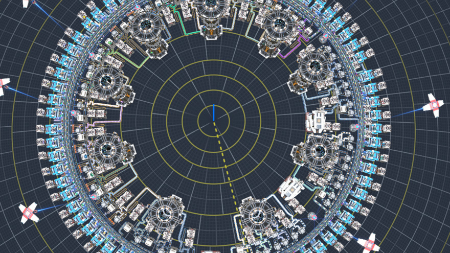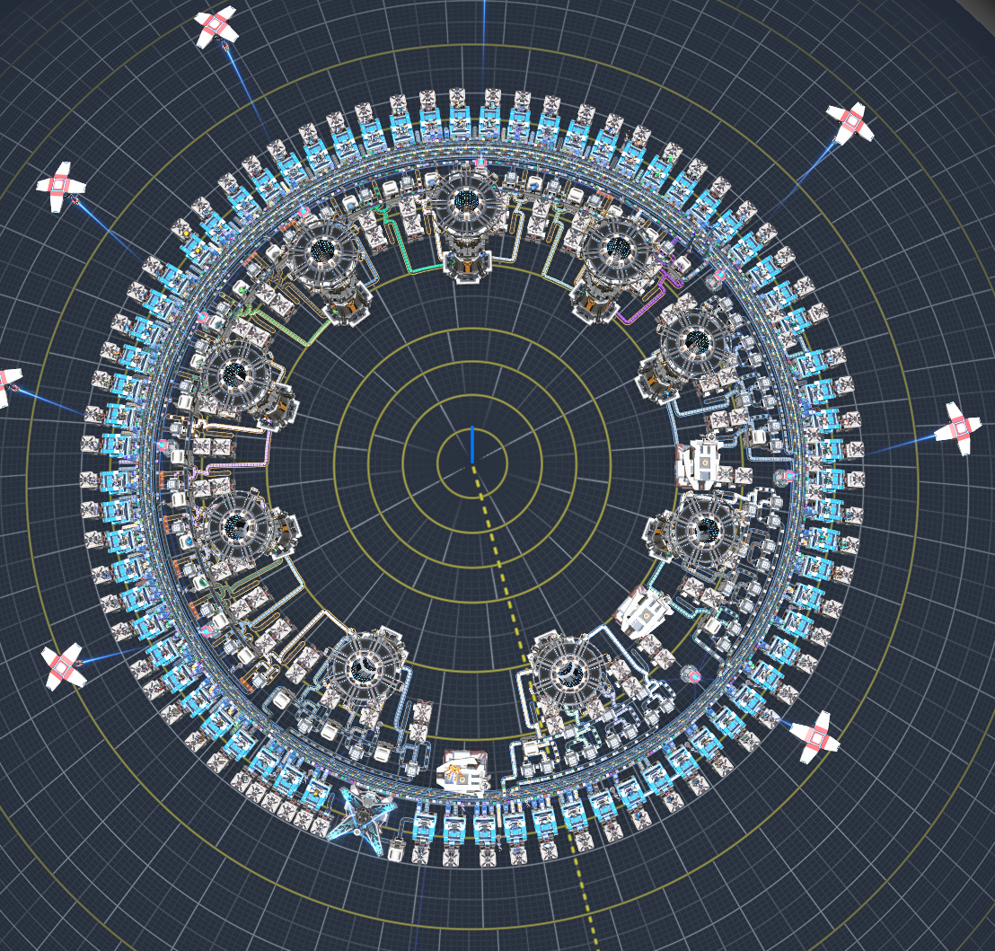 A polar mall that can get ressource both from bots (preferably farming DF ) and PLS, use verticaly stacked sushi belt for compactness The polar center is still mostly free and can be used to put in a science hub for exemple, or anything your heart desire If any jam happen, just put depot box on top of the type 2 splitter ( the "long" one ), it will resolve itself
