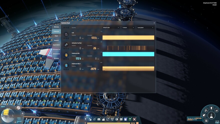 The assemblers are set to speedup (uses less factory entities) however if extra product is wanted: 1. Change the first row of assemblers to extra product (copy/paste recipe hotkey is helpful here) 2. Copy the first row (make it assemblers only by right-clicking on the uneeded buildings) 3. Paste on each of the remaining row. 4. This will yeild Proliferator (mk1) 108,000/min from Coal 86,400/min If you want to go back to speedup I recommend redoing the blueprint.