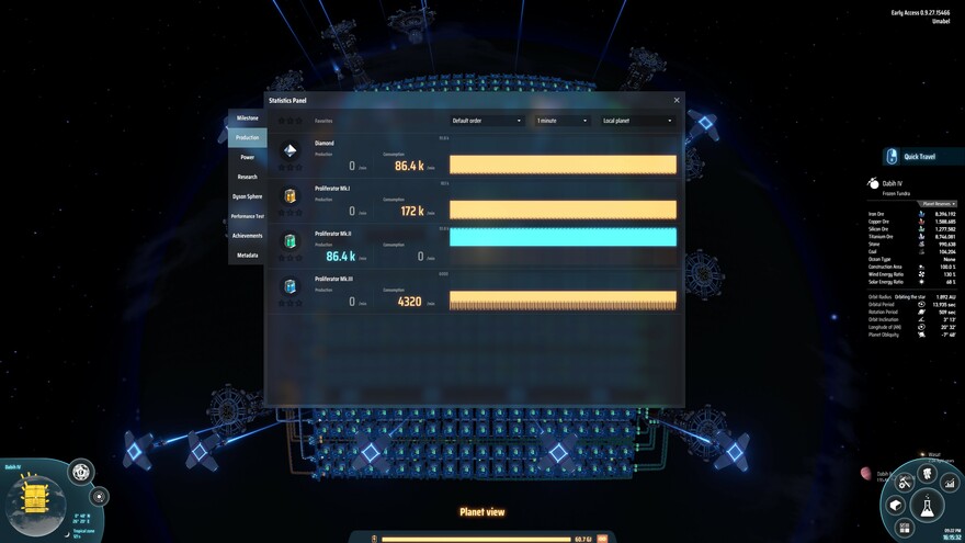 The assemblers are set to speedup (uses less factory entities) however if extra product is wanted: 1. Change the first row of assemblers to extra product (copy/paste recipe hotkey is helpful here) 2. Copy the first row (make it assemblers only by right-clicking on the uneeded buildings) 3. Paste on each of the remaining row. 4. This will yeild Proliferator (mk2) 86,400/min from Proliferator (mk1) (86,400/min) and Diamond (43,200/min) If you want to go back to speedup I recommend redoing the blueprint.