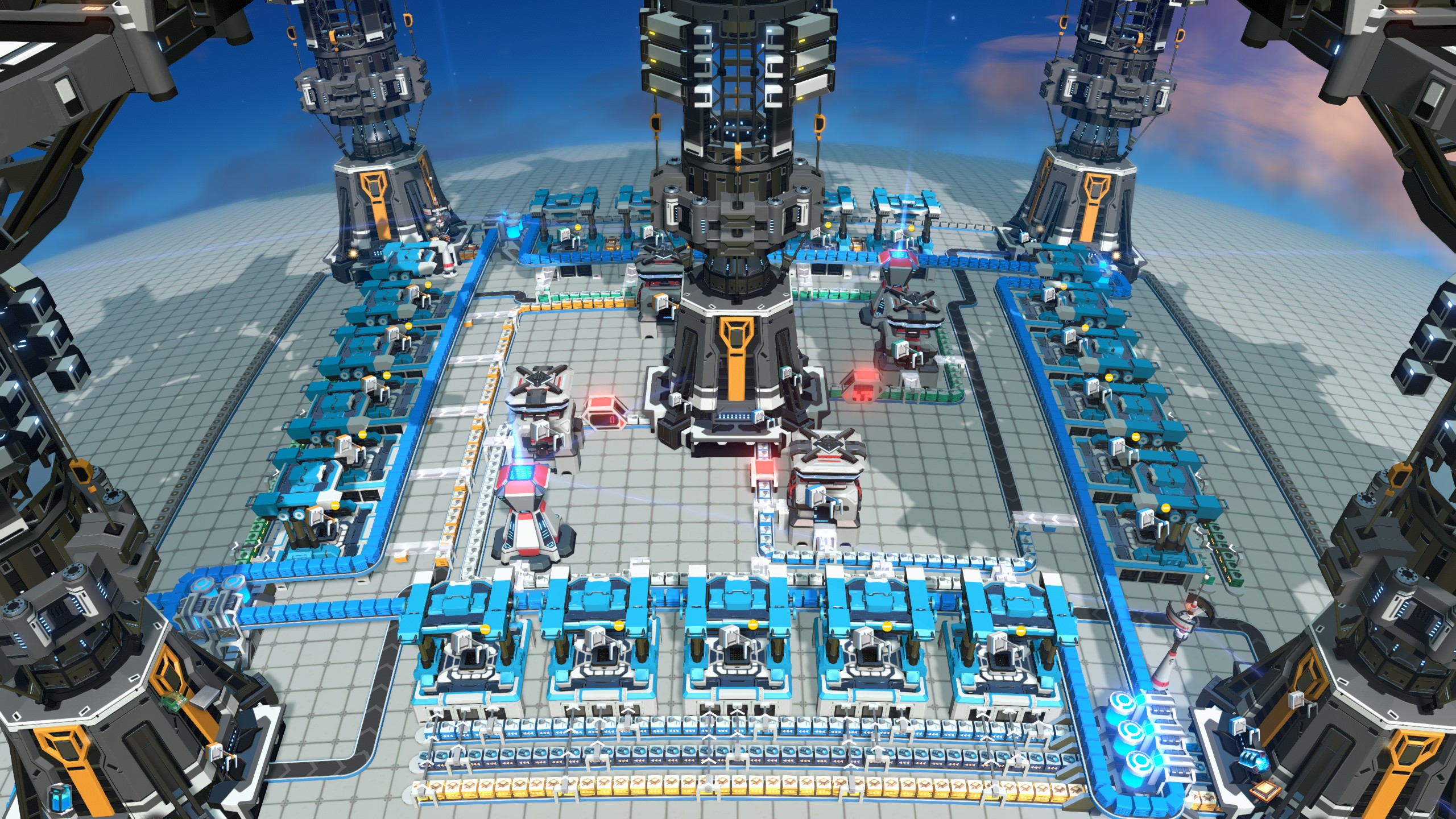 Select the assembler recipes. If any building needs a fifth input material, make sure it is available on the next corner ILS. Run a belt from that ILS to the assemblers through the space that has been left open for this purpose, place a spray painter and attach sorters.