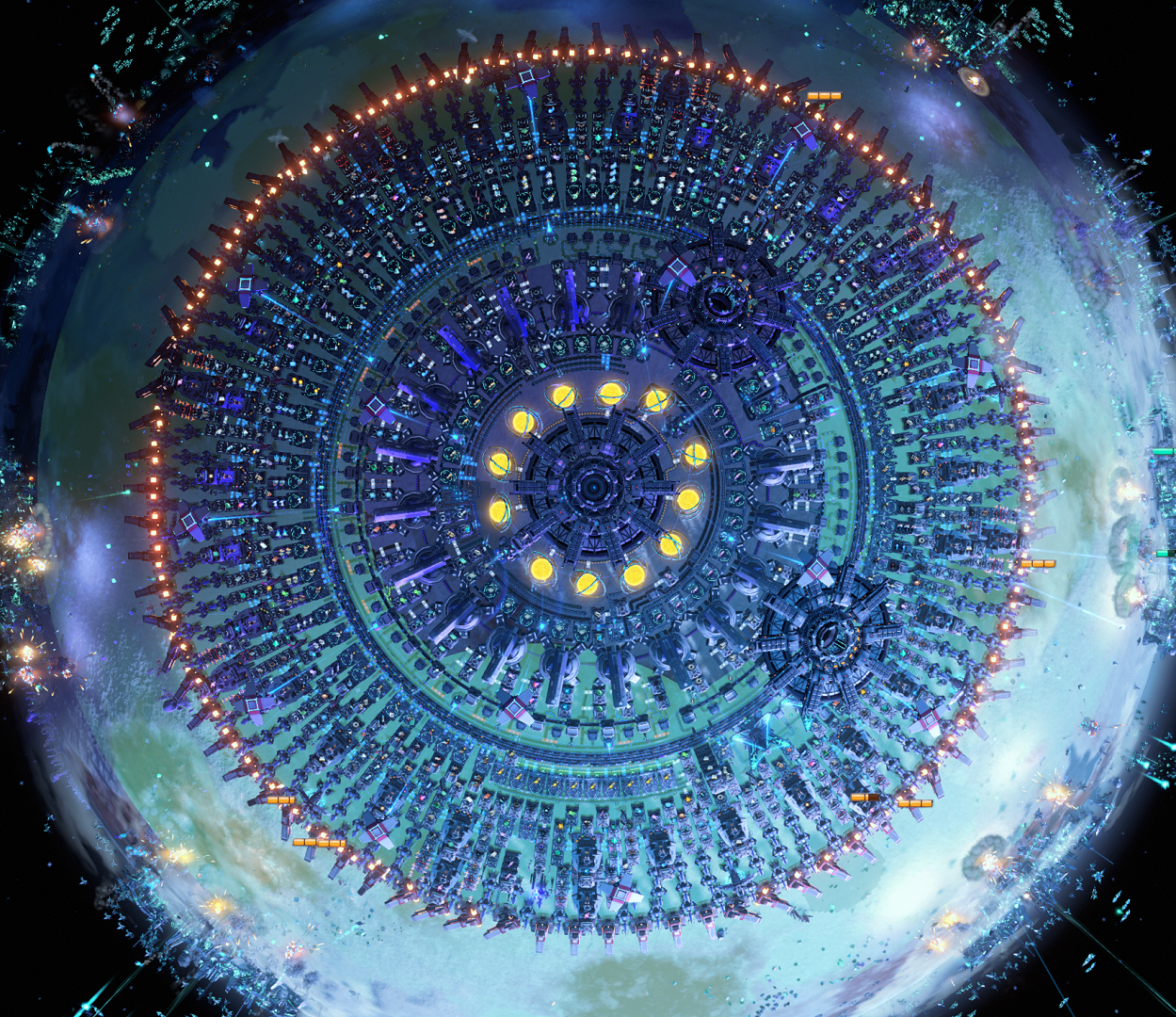 Changes: -Slightly more compact and with more turret coverage -No more missile turrets, only T3 shells -Builds it's own shells but can also import -Builds its own fuel, so once the bases hit level 27 it'll be building lots of fuel which you can export to the rest of your cluster -Builds antimatter capsules so space fleets won't be a threat -Added a second shield generator to keep new bases from landing in range of the turrets (results is more active bases on the planet)