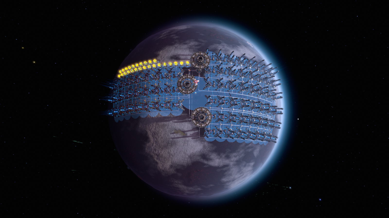 An expansion on my earlier popular design. (Thanks for that.) Expanded to three rocket banks for a total of 720 launches per minute when using proliferated rockets. When the frame is complete, turn off remote demand, up the maximum rocket storage on the main tower, turn the launcher feeds off, and turn the return feeds to the main tower on. All rockets will return to the main tower for pickup. With a proper retrival on your rocket planet, turn on remote supply and they will be picked up for re-use. If I get enough likes, I may make a 4 banger.