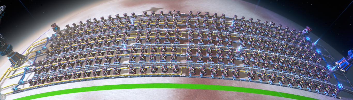 I included SS' of both ends of this Foundry, as well as a planetary view so you get a better idea of how large this is. It is designed to meet the Interstellar Logistics Vessel max capacity, once per minute. It was not meant to be compact. I tried to make it as aesthetically pleasing as possible..... but... c'mon!.... it IS a Foundry