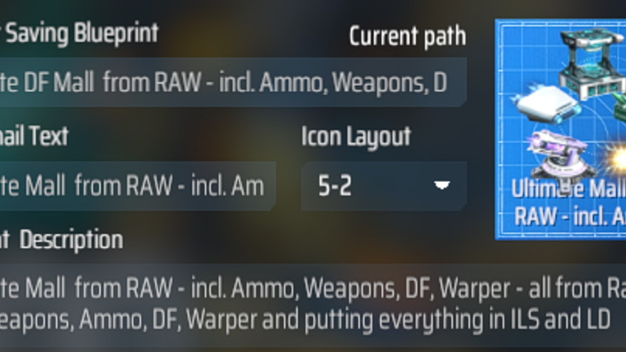 I looked for a Mall that uses DF buildings and creates all buildings incl. DF, all weapons, ships, warper and ammo ..also I wanted every item shipped via ILS and Logistic