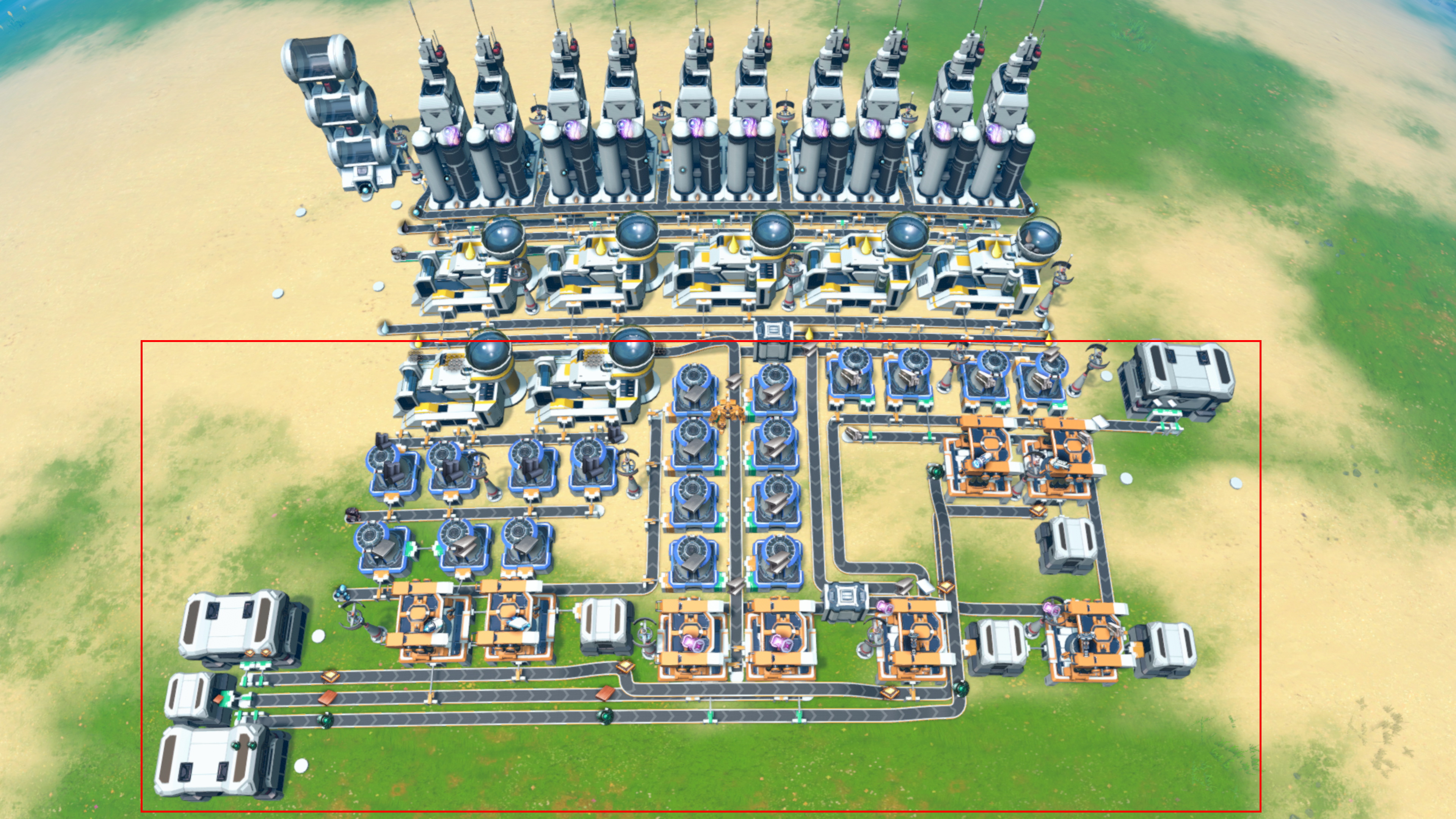 Input: 5/s oil, 6.66/s stone, 3.33/s water (4 Pumps), 4/s coal , 6 Iron Ore, 4.16 Processers*, 1.75/s copper, 3.66/s Titanium Ingot*, 1.33/s Electromagnetic Turbines. *Titanium & Processors will need to be brought in manually and placed in storage boxes until stations can be placed in blueprint part 3.