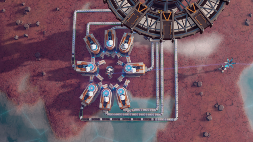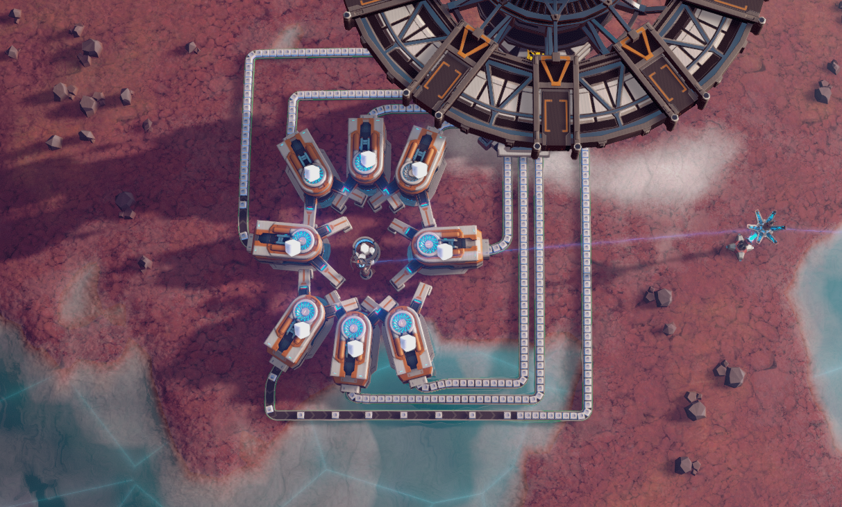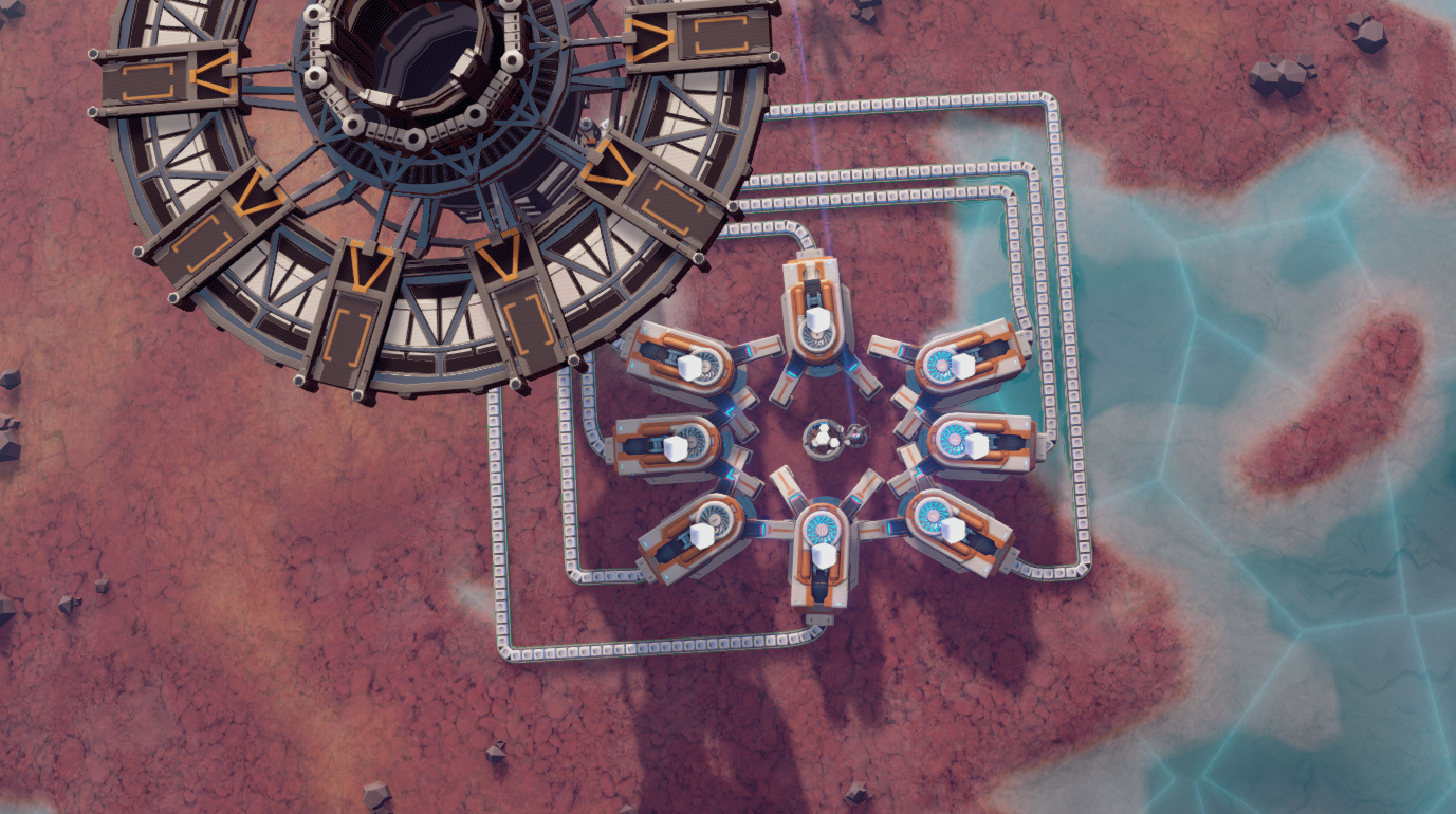My mining setup for one ore vein. You can get up to 12 miners on one ore vein, but I was not able to create functioning blueprints from them.