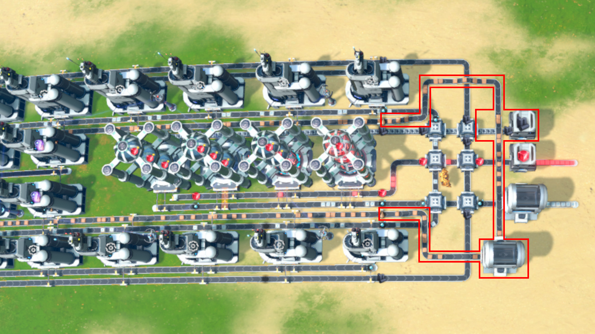 Once X-Ray Cracking has been completed, remove these two temporary adjustments from this blueprint. You can pipe back in the stored Refined Oil at the beginning, or just delete it (Shift + Delete).