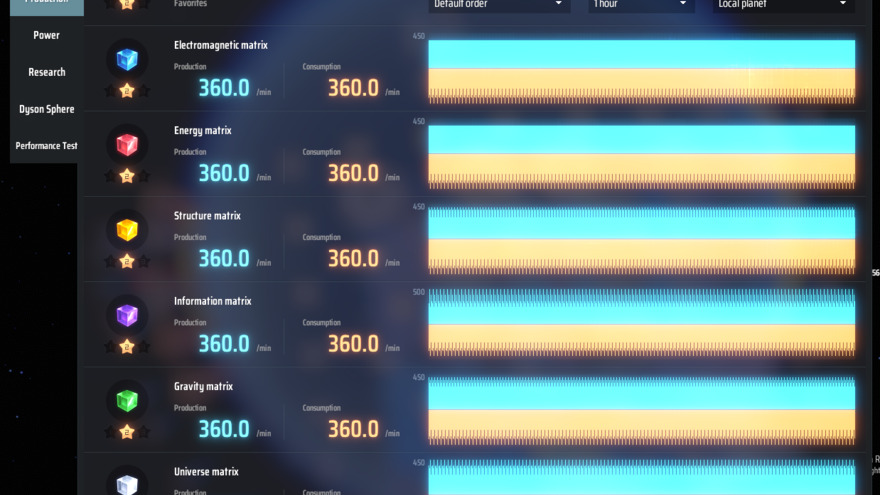 - [30/s] Deuterium (rare, harvest deuterium gas giants or set up fractionators) - [24/s] Fire Ice (rare, gather from gas giants or mine) - [12/s] Spiniform stalagmite crystal (rare, all water worlds are usually a good source) - [12/s] Organic Crystal (rare, mine or manufacture elsewhere) - [6/s] Critical Photon (note: This build accepts photons, not antimatter) - [174/s] Iron Ore - [168/s] Silicon Ore - [96/s] Copper Ore - [96/s] Titanium Ore - [84/s] Hydrogen - [72/s] Coal - [24/s] Stone - [12/s] Crude Oil - [12/s] Water
