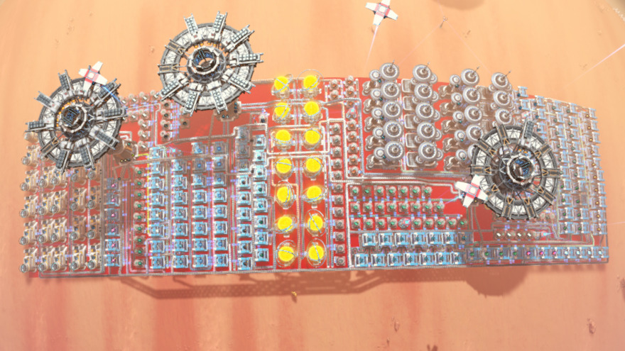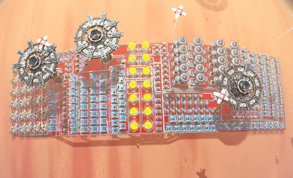 This blueprint will take in raw resources and produce small carrier rockets at a speed of 30 per minute without the use of any drones. It also includes the power required to run it.