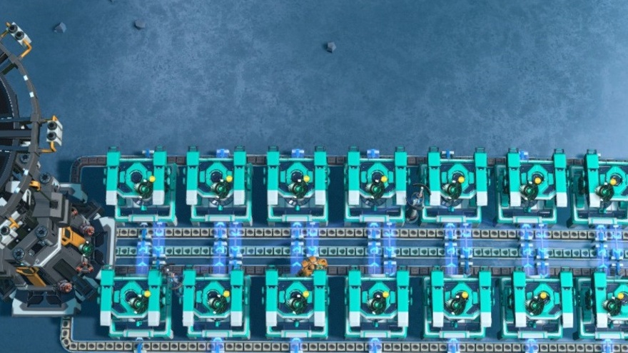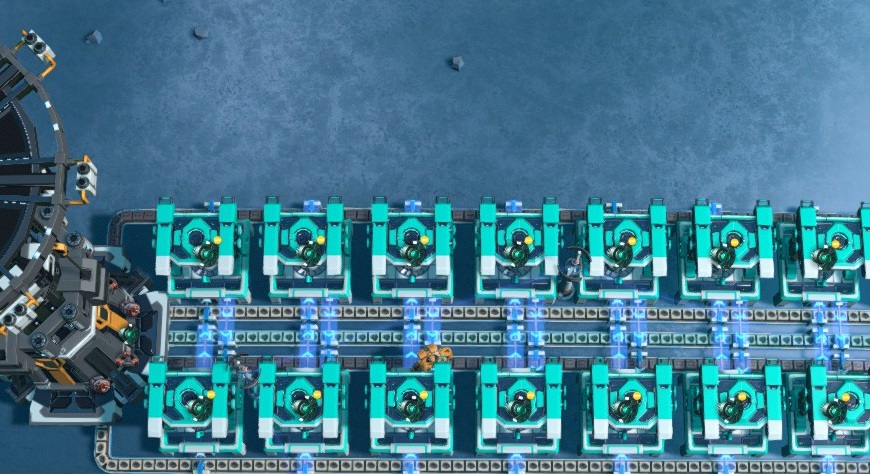 Simple two rows of 20 machii assemblers producing electromagnetic turbine taking input and output from a logistics station