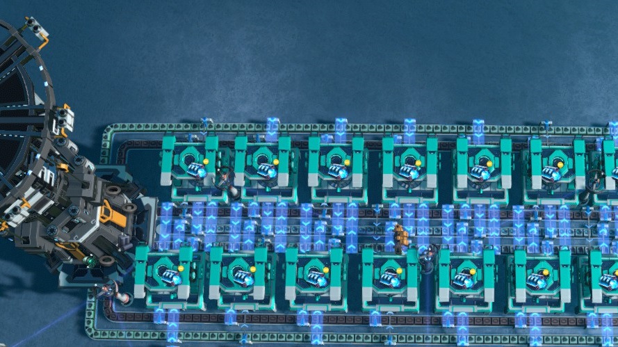Simple two rows of 20 machii assemblers producing super-magnetic rings taking input and output from logistics stations.