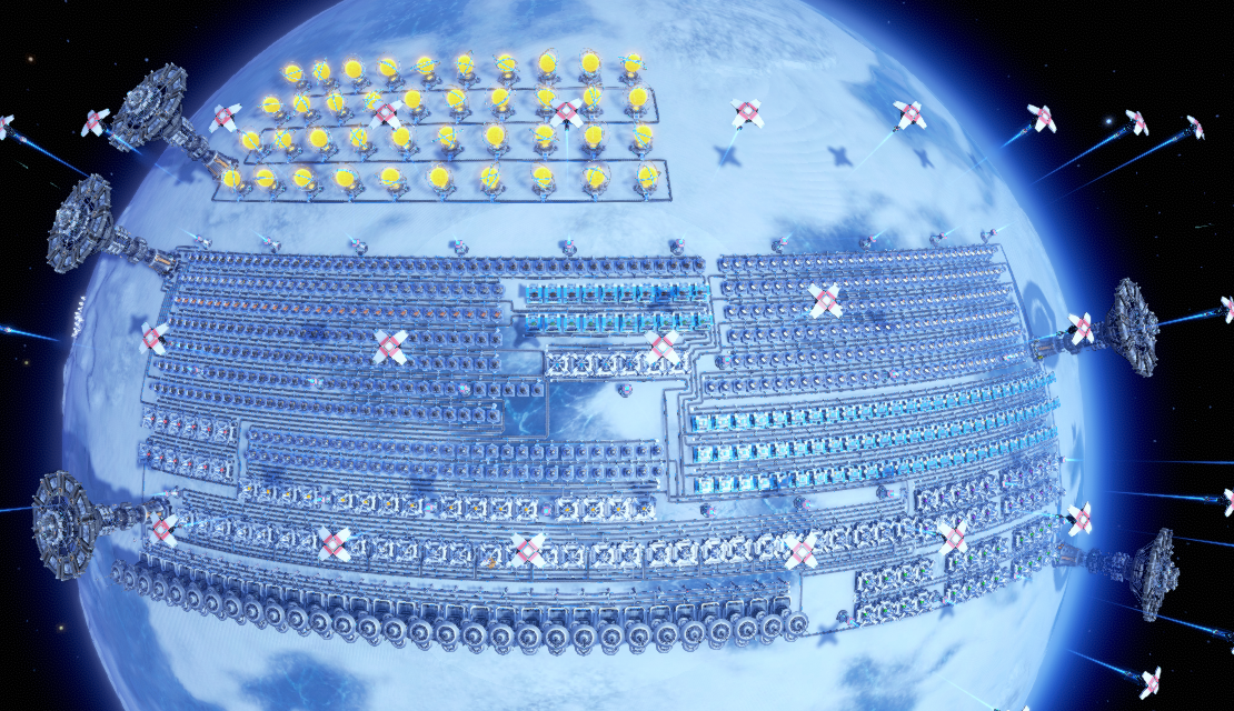 Make sure the reference Interstellar Logistics Station is pasted on 27°N/S,0°/90°E/180°/90°W. If used correctly, you can paste this blueprint on a planet 8 times and produce 14400/min Universe matrix.