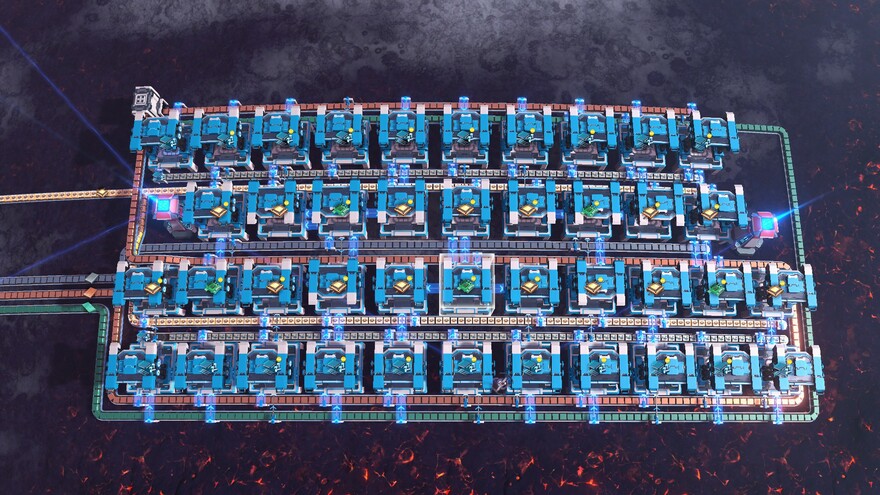 Inputs processed ores (iron, copper, and silicon ingots) only. My 3 quips on this version are (1) the first processor assembler on the bottom left is underfed (2) haven't bothered yet with a belt trick to replace the splitter on the top left (3) using a tesla tower just for the last assembler in the bottom middle that isn't reached by the satellite substations.