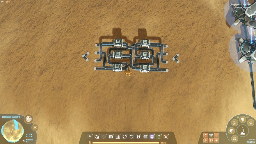 A Factorio-style 4x4 belt balancer. Includes small arrows indicating input and output direction for easier placement from the blueprint interface.