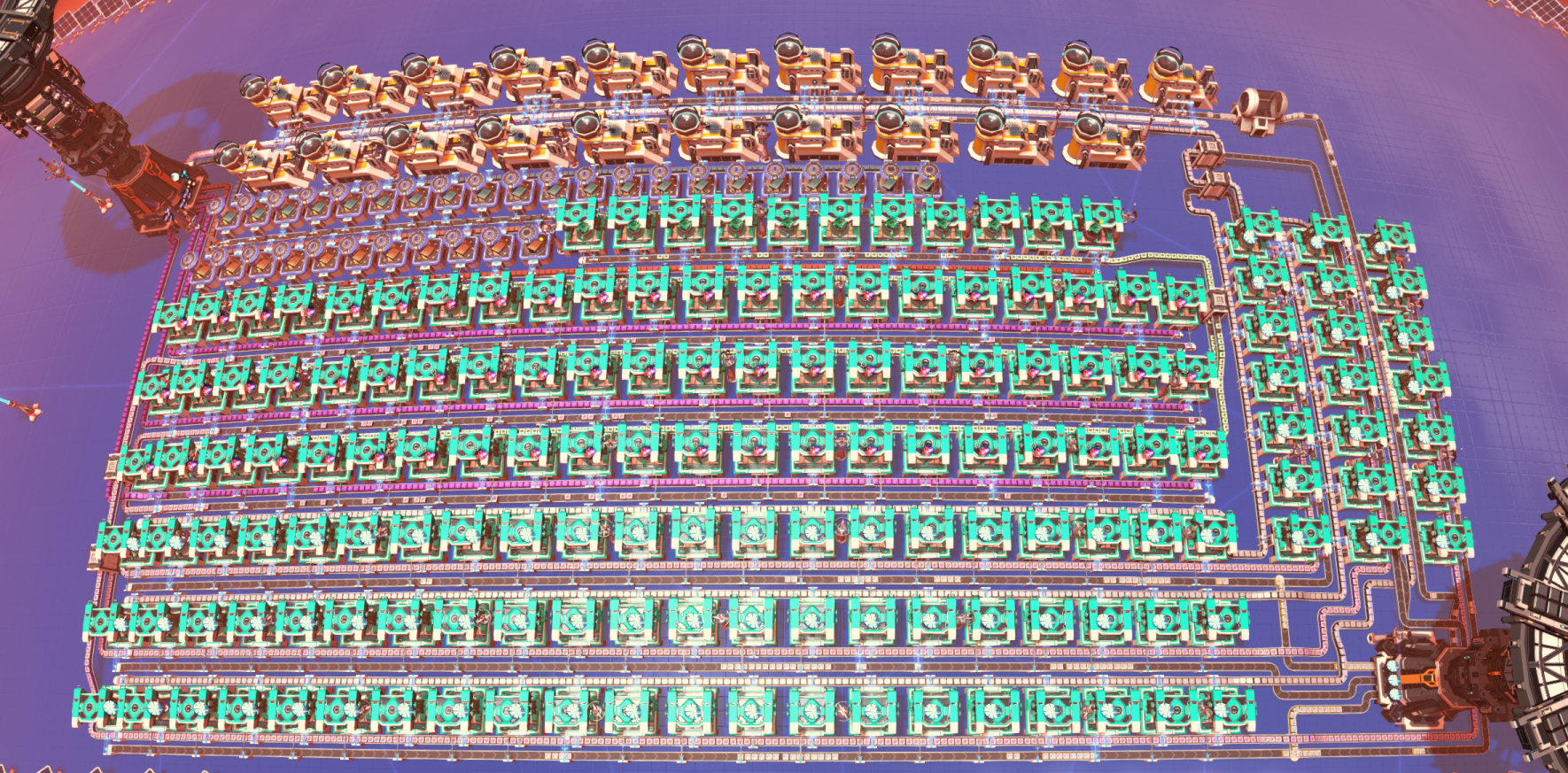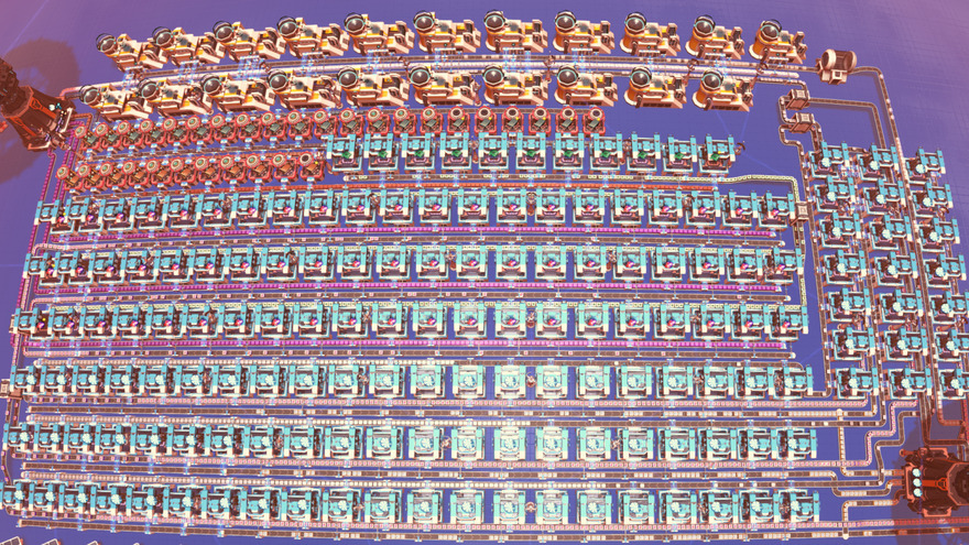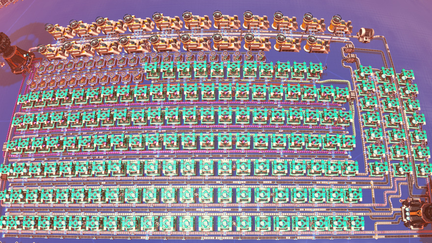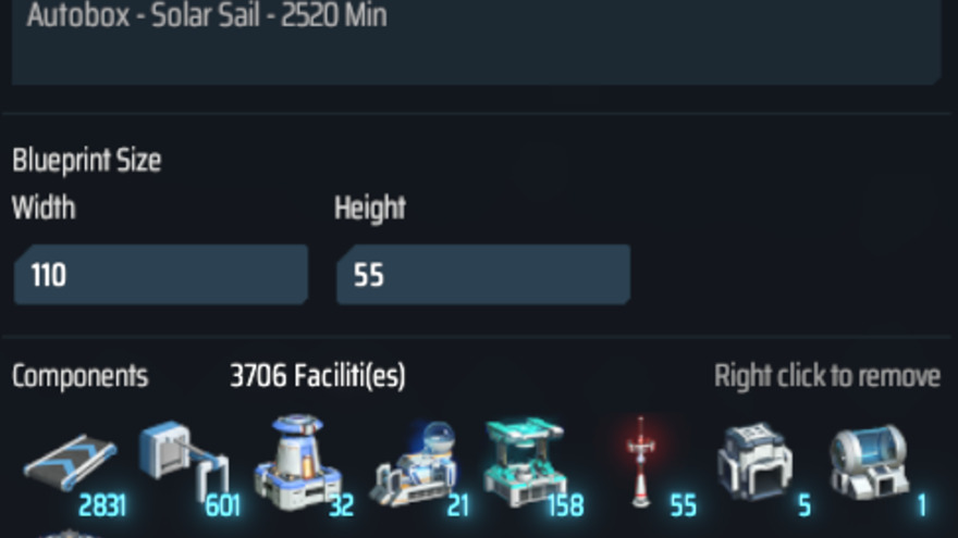 Produces 2500 Solar sails per min. Uses Iron ore, Copper ore, Optical grating crystal and Fire ice. Hydrogen overflow is sent to outgoing tower for export.