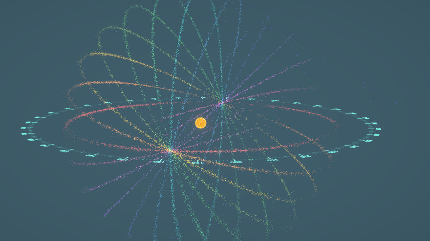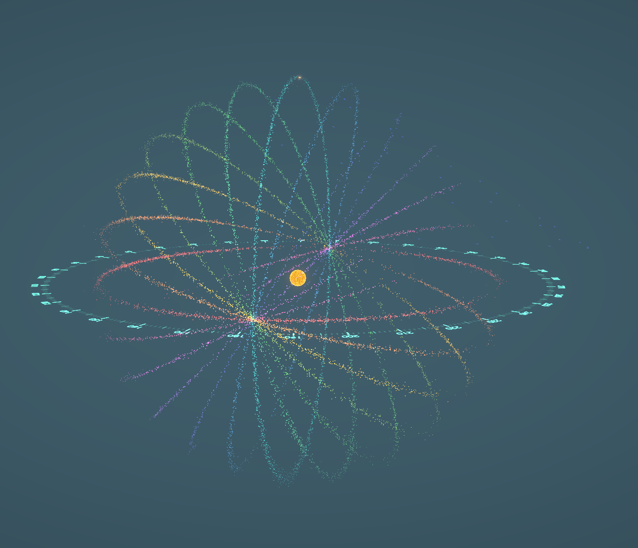 12 Orbits splitted every 15º and different sail color 30 hue value appart from the others. It creates a nice rainbow effect.