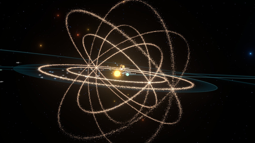 This is a starter double-layered solar sail setup, with a total of 8 unique orbits.  It's become my go-to setup for new hard games where you need the sails power to get you over the power-creep-hump before you can get into frames and the like.  I only start launching sails after I've maxed out the solar sail lifetime bonuses and a 'lot' of the solar reclaimer's %+ angle improvements.  Either all the way through purple or sails through purple and energy capture at least through yellow.  The inner and outer orbits have counteracting orbit-directions as well as do each of the rings compared to their neighbor, and the varied angles-of-attack needed for the different rings helps to easier position EM-rails for continuous-fire-insertion.  Only the equatorial ring spins in the same direction both inside and out, as I thought it added a level of realism and believably (and looks really good).