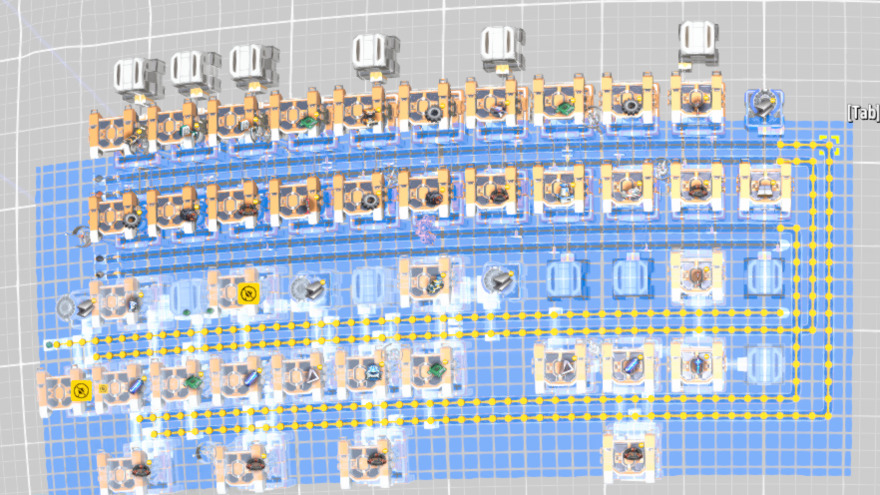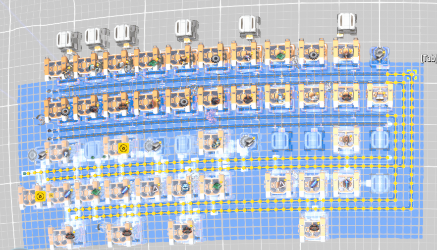 This is a blueprint that help you quickly produce bulidings when you start a new game. And this is just part three(Because your blueprint level can't catch up at first and the productivity is also the same). Again,build it along the belt. Make conveyor belt fully delivered.